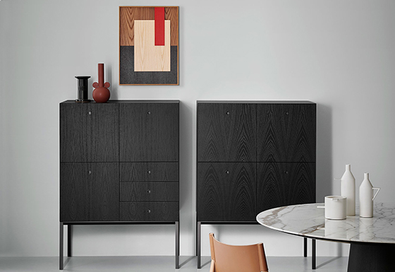 A total look in wood for the Offshore cupboard, with natural maple inside and black open-pore stained ash outside, ideal complement to the dining room for storing plates, glasses and cutlery.