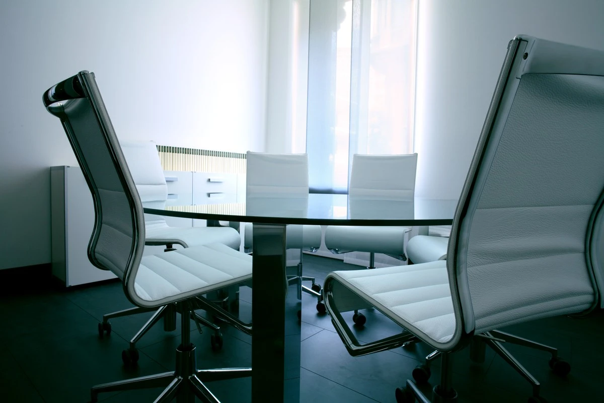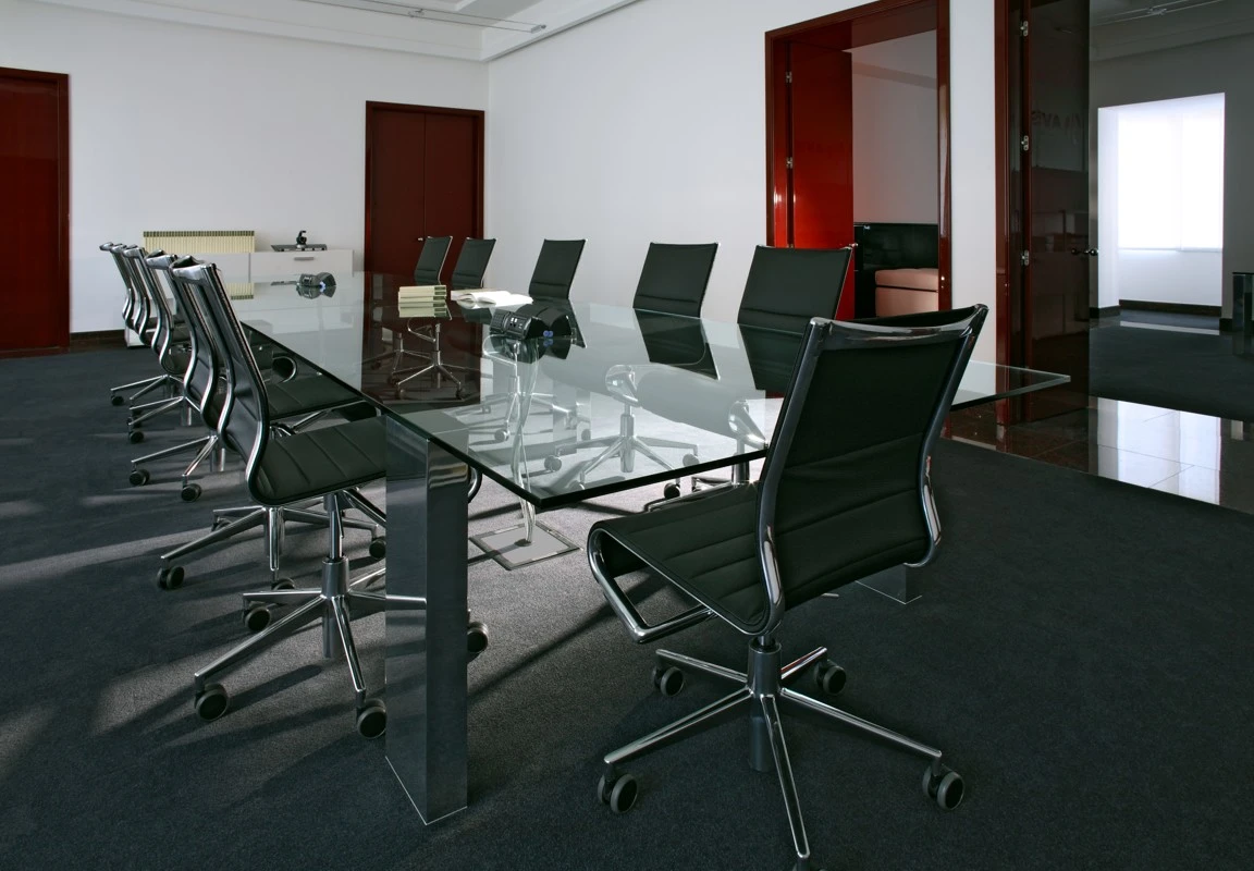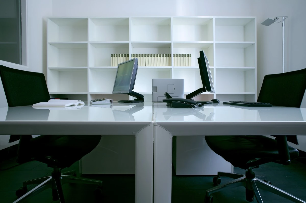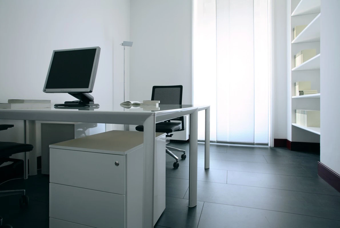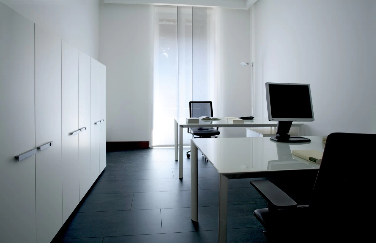 If what is prevalent in the meeting rooms is the strong physical impact of Beam Glass, the table with tempered glass top and polished aluminium structure, available in the round version or in the extra-large rectangular one, the workstations, on the other hand, are composed of the RAM table with steel structure and glass top and the Homework chests of drawers, both lacquered chalk white.