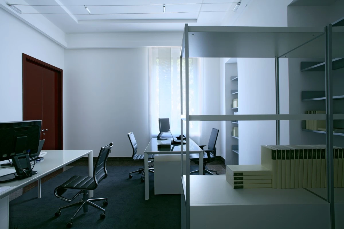 The interior layout, handled by Spotti Contract, in fact inserts into a context of extreme formal orderliness - 500 m2 prevalent in which are the white of walls and ceilings, the red of the doors and the soft shades of the stone or wood floors - the most recent compositions of Homework, the Porro collection for working environments that has come about through the transformation of proposals initially conceived for the home and the result of the observation that, in offices too, the choice of furnishings is increasingly a response to personal aesthetic demands and criteria.