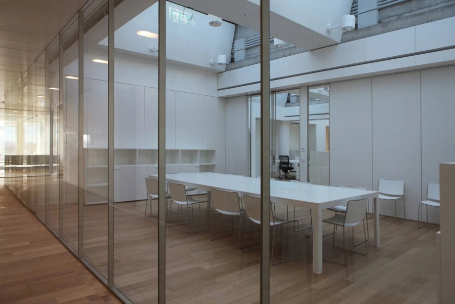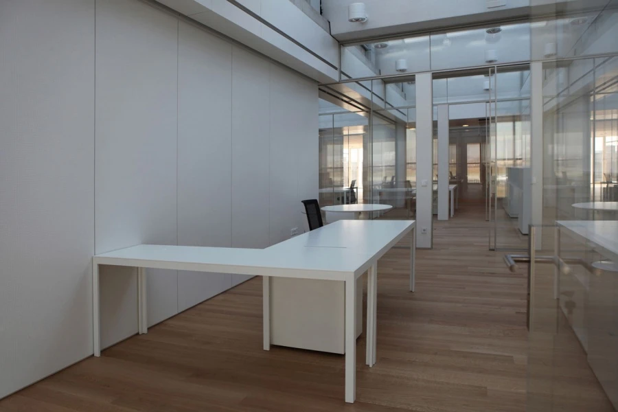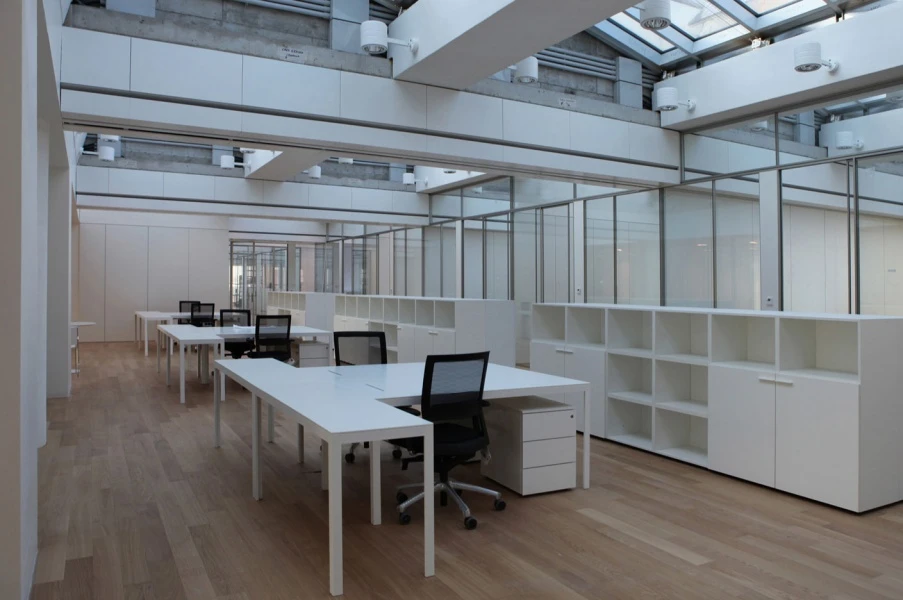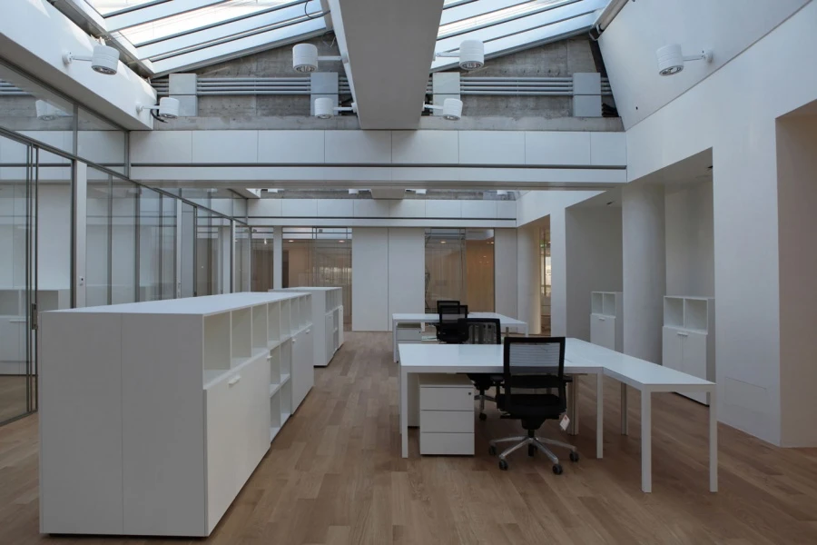 White is the leitmotif of the different spaces, leading to a clean ambience which does not disturb any working activity, the warm wood flooring and the consistent separating walls dividing spaces which are anyhow visually directly communicating as well.