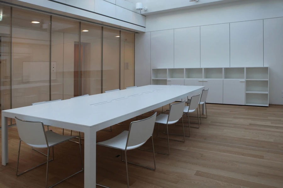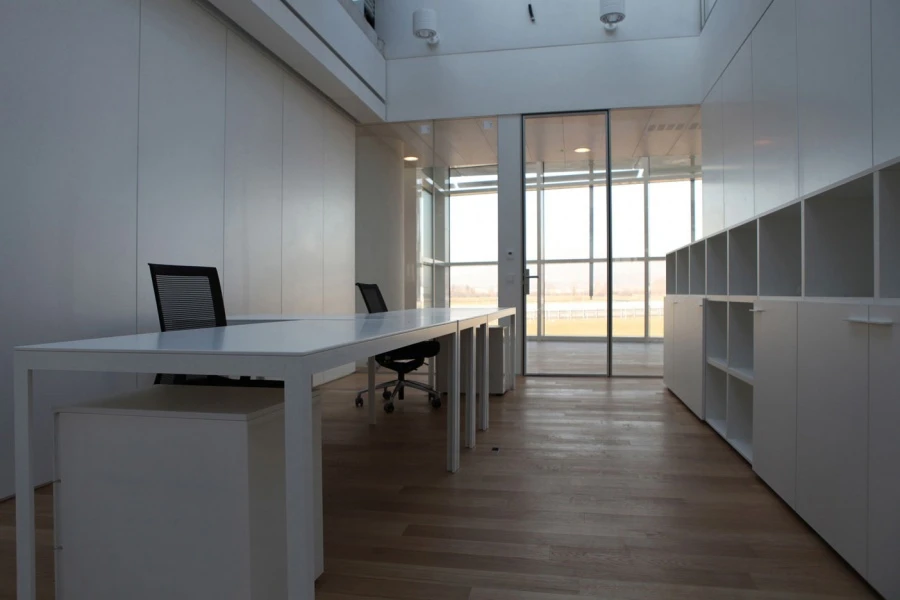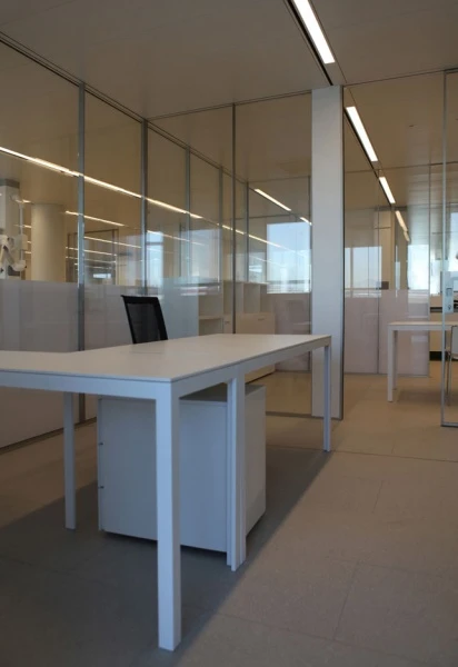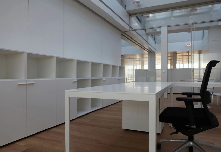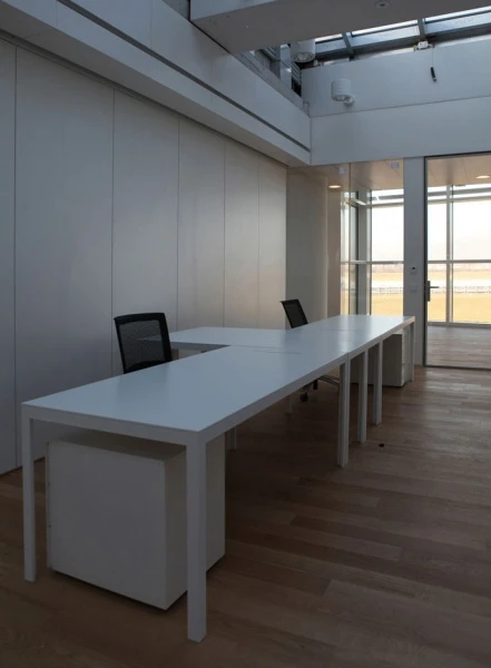 On the first floor, suggestively lightened by natural light from the roof, the wider and more refined offices are furnished with white lacquered tables with a high resistance surfaced top, with the Join round white small tables, used as a meeting place for informal meetings, while for the different meeting rooms, wide supporting tables are available, with Fractal in different sizes, ad hoc models or matching different standard Fractal tables as to provide for the best possible modularity. The library, opened with a wide continuous glass window on the surrounding landscape, is furnished with 10 System compositions, the unit bookcase unit program with open shelves, making it a required furnishing unit for the house and the office, fitted with high resistance back panels with an ad hoc designed magazine display and a library archive cabinet. The meeting rooms on the three floors are furnished with in total 11 HDS or high resistance Fractal tables fitted with top access and basin.
