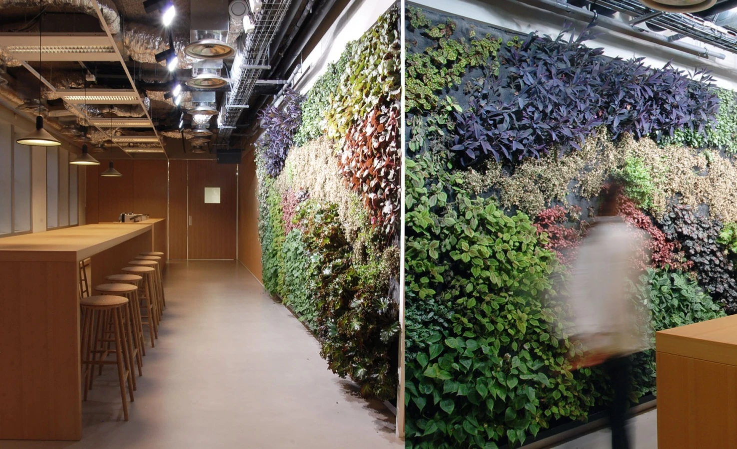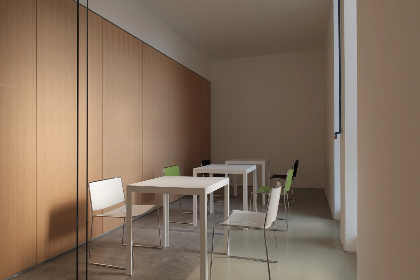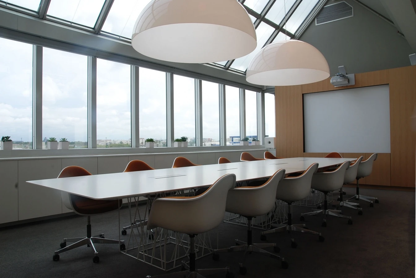 The ground floor is the setting where the most representative functions take place, including a showroom where it is possible to set up events and presentations, a screening room with a state-of-the-art video/audio system, a cafeteria with a large green wall and a gym for employees.