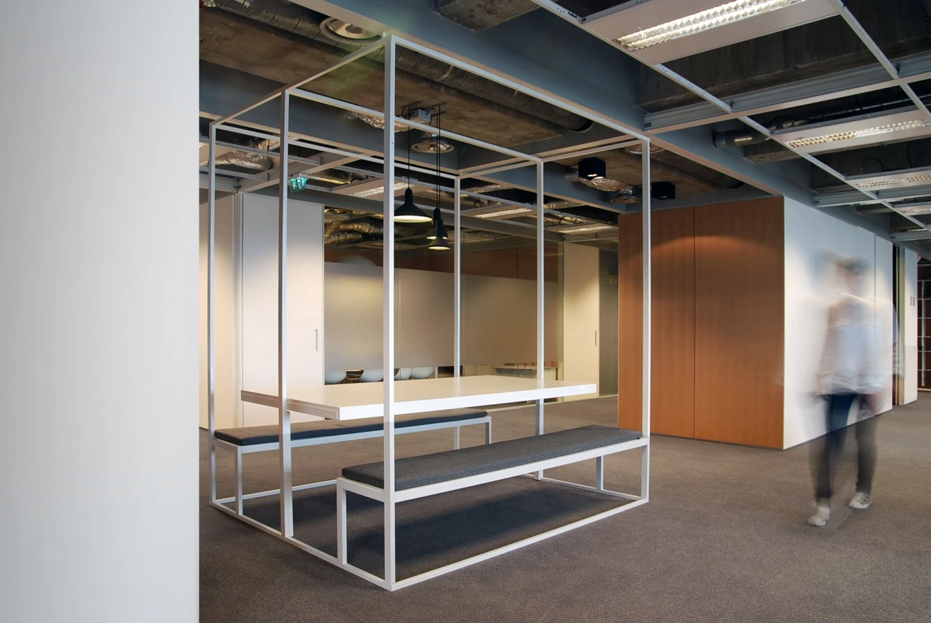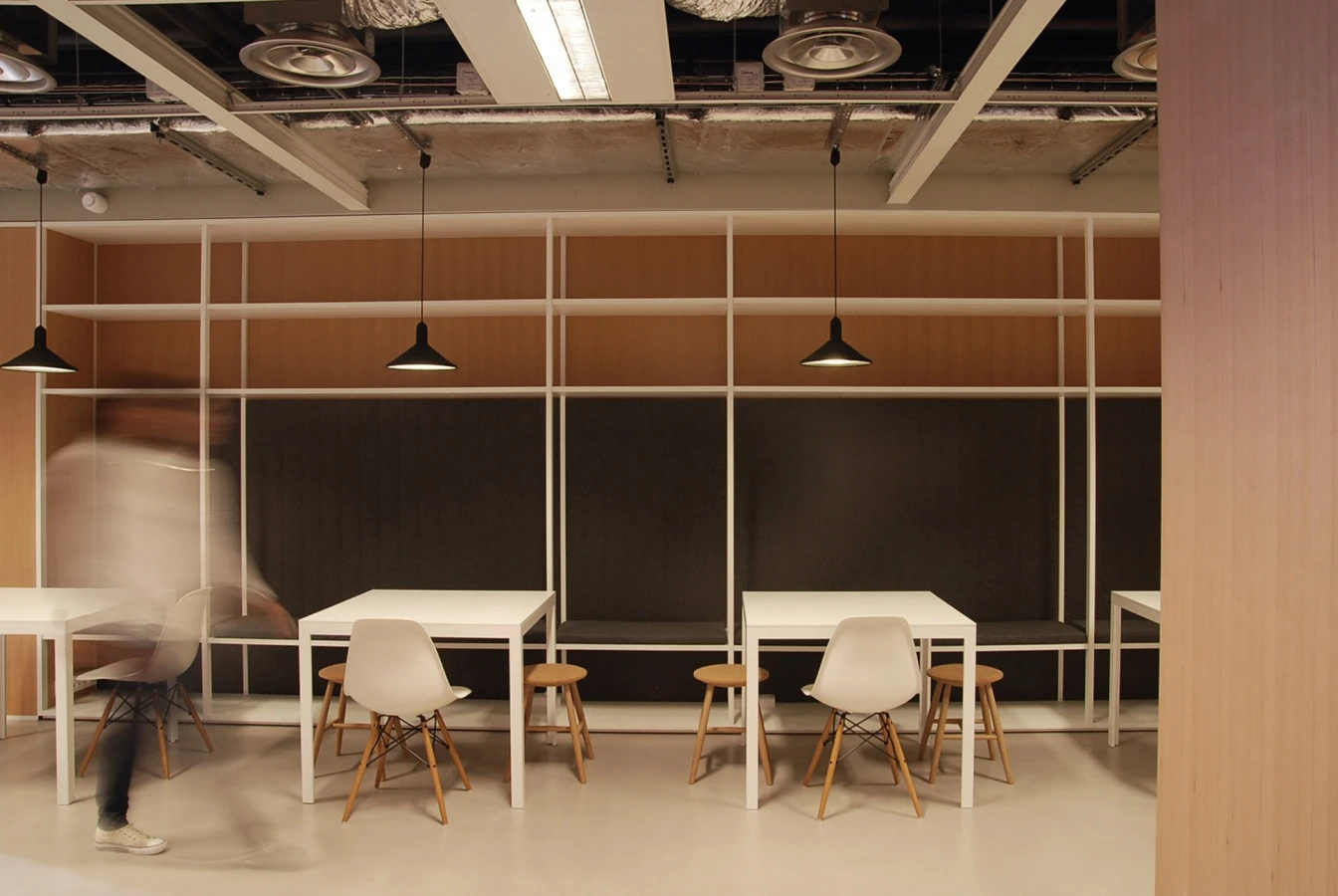 The area design, entrusted to RBS GROUP Italia, starts from a modular ceiling-grid that makes it possible to modify the spatial scansion of indoor and outdoor spaces over time. The knitting in white aluminium edging also divides space vertically, we can find an open ceiling above it with exposed pipes and machinery, whereas the underlying space is regular and neat.