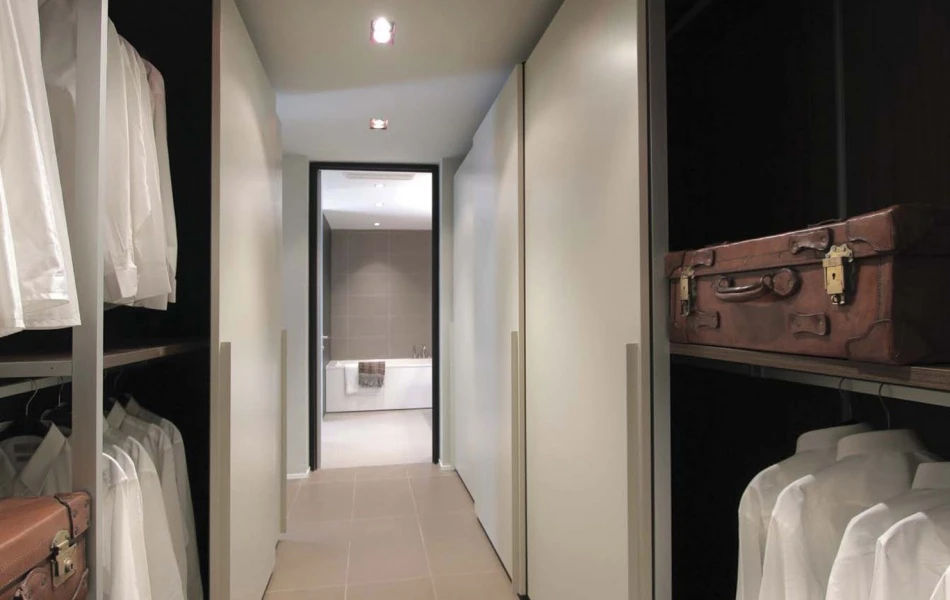 In the night area Storage system of wardrobes, proposed with matt white doors, Segno handles and Mogoi interiors, creates a discreet and refined equipped wall leading to the bathroom.