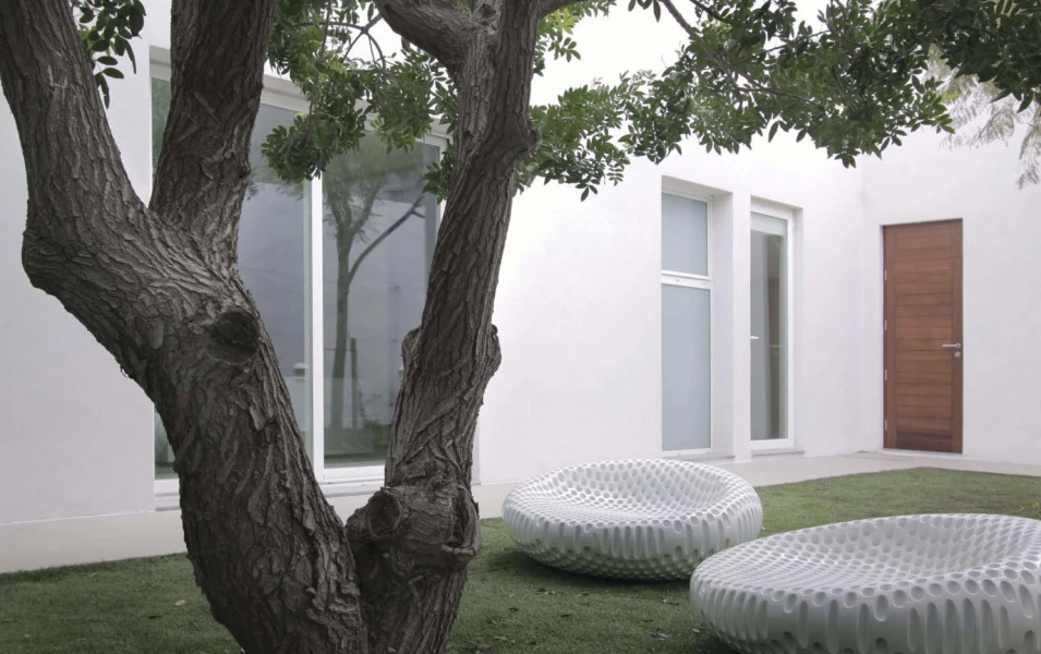 In the living room, the black lacquered Modern sideboard on “Anello” feet offers a continuous support base and a capacious storage space, in the same way as the white Modern sideboard in the dining room. In the kitchen, white lacquered Spindle stools surround the suspended stovetop, while the garden is enlivened by Truffle armchairs in thermoplastic material, informal and highly versatile, perfect for outdoors.