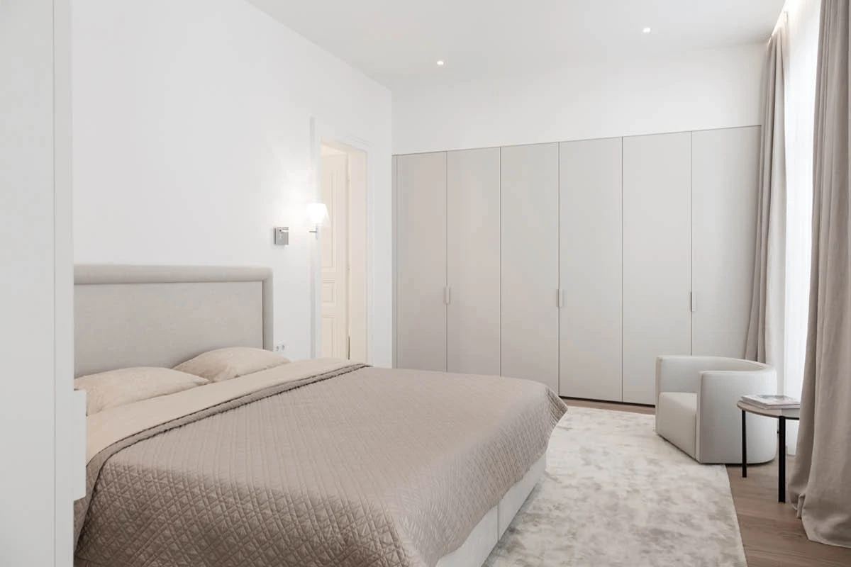 High above Vienna, the classical tradition blends with modern exclusive design. The charm of an old Viennese apartment of the late nineteenth century is enhanced by the project of Steininger.designers, among Porro's best international retailers. The apartment is dominated by a bright, straightforward spatial effect that highlights the fineness of ancient doors, walls and ceilings. The contemporary design fits discreetly, favoring comfort and quality of materials: such as the Hinged Storage wardrobe, an architectural sign bringing harmony and sober elegance in the bedroom.