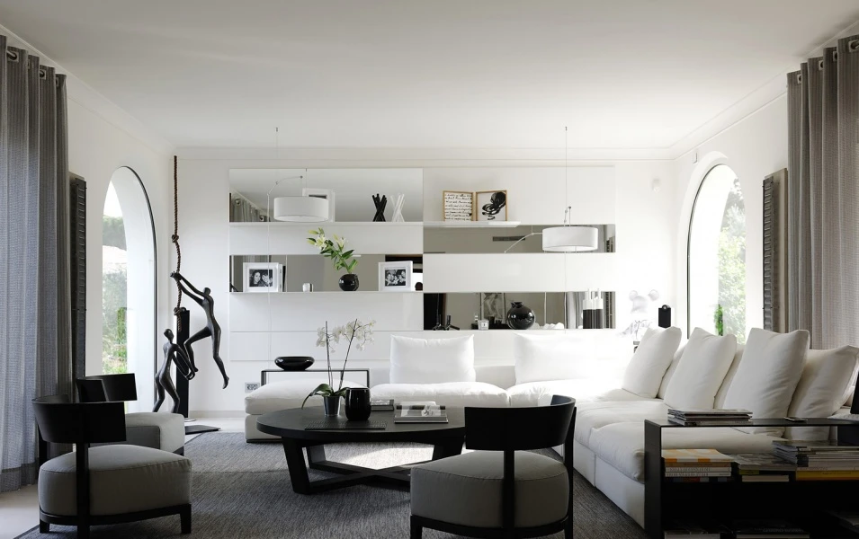 The living room of this home shows a Load-It bookcase, composed of panels in glossy white and mirror, that give bright depth to the room.