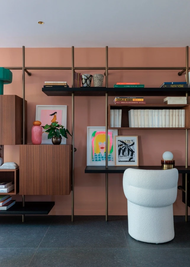 In the living room, an equipped wall is created by the Boutique Mast by Piero Lissoni, the Porro system with nautical lightness and graphic linearity that allows maximum freedom of expression. Between the vertical sequence of metal uprights in burnished brass finish and the horizontal cantilever wooden shelves and suspended top in black stained ash, open modules with mongoi interiors and natural canneté doors, preciously refined with a 45° corner jointing, are fitted, chosen among the Porro woods.