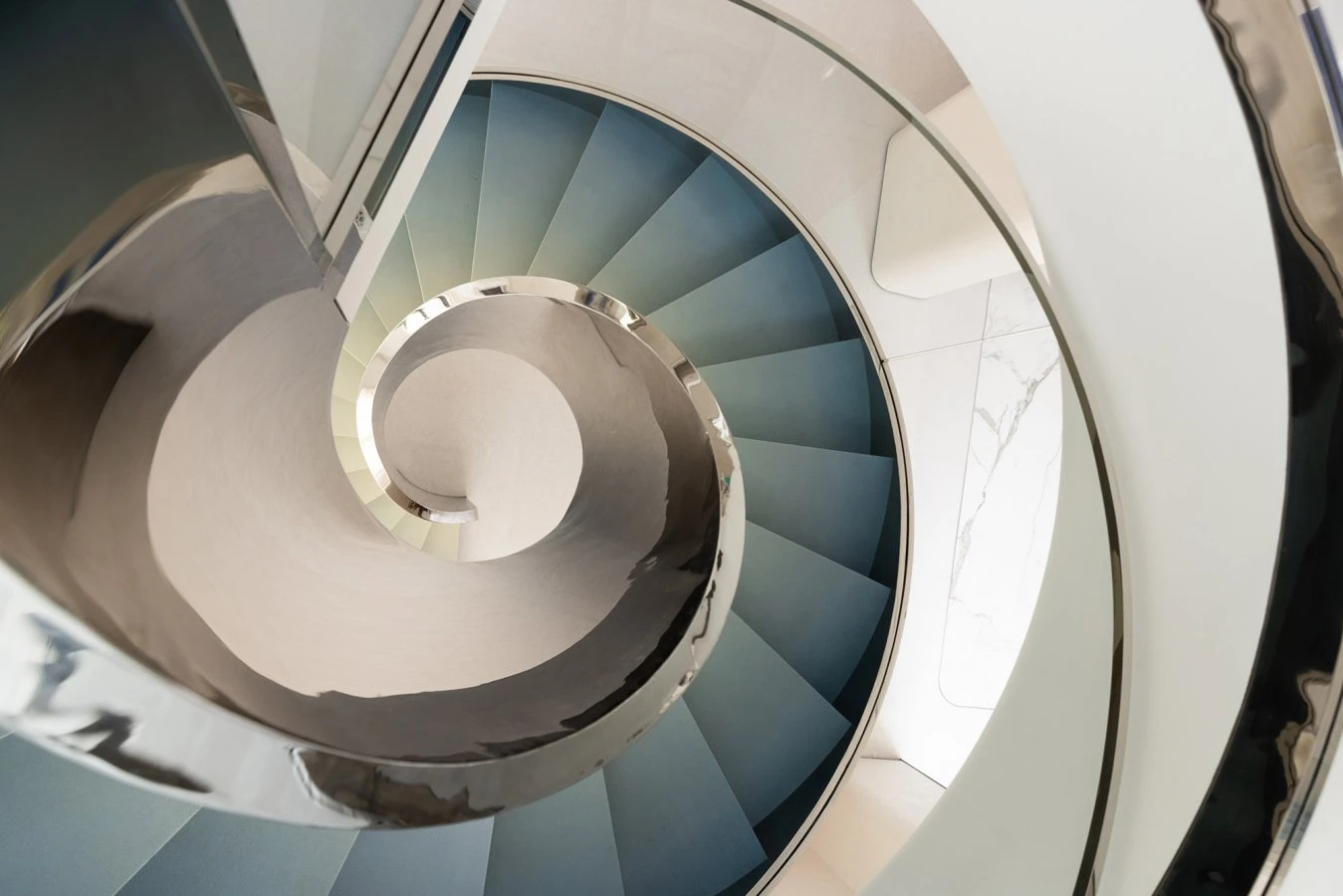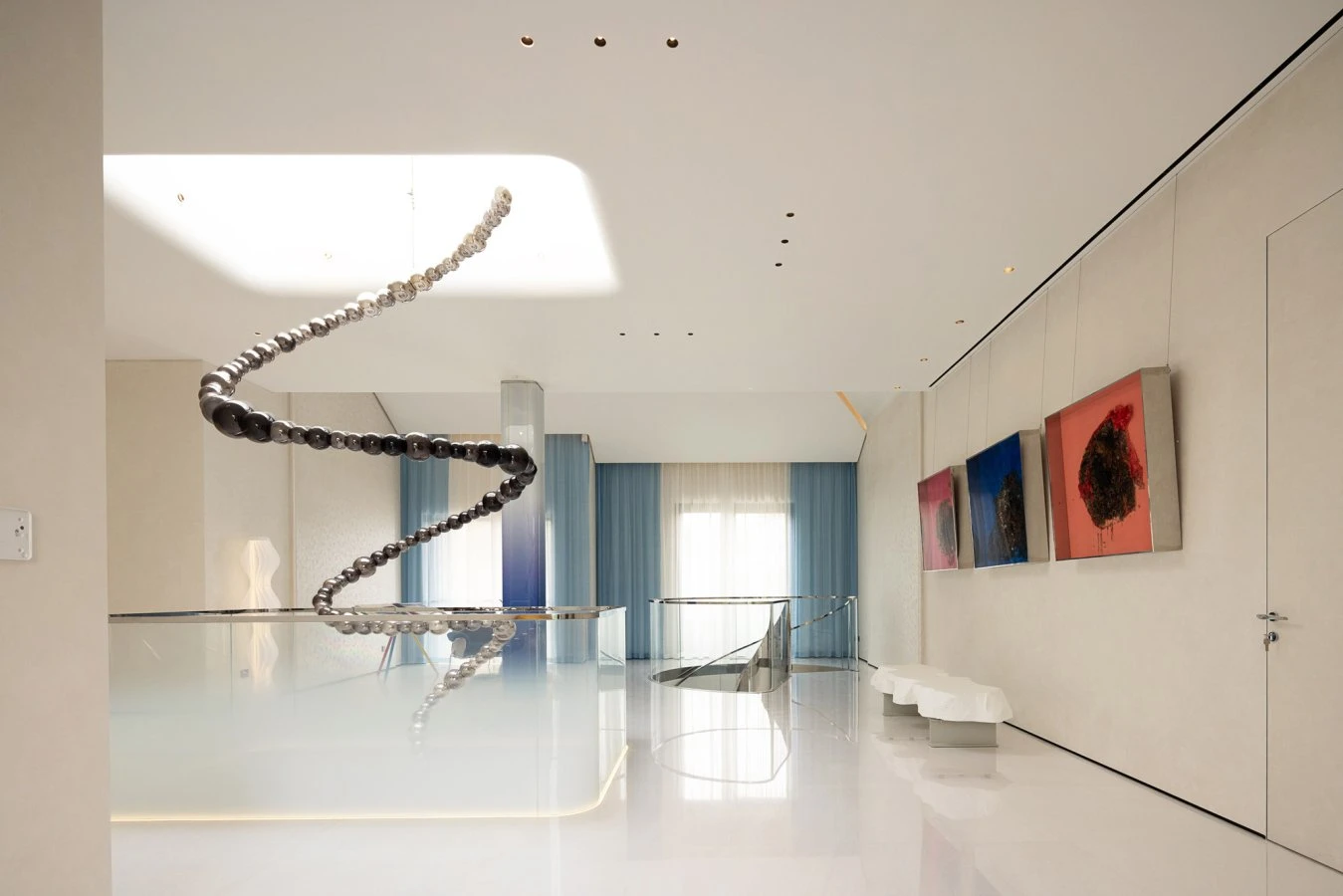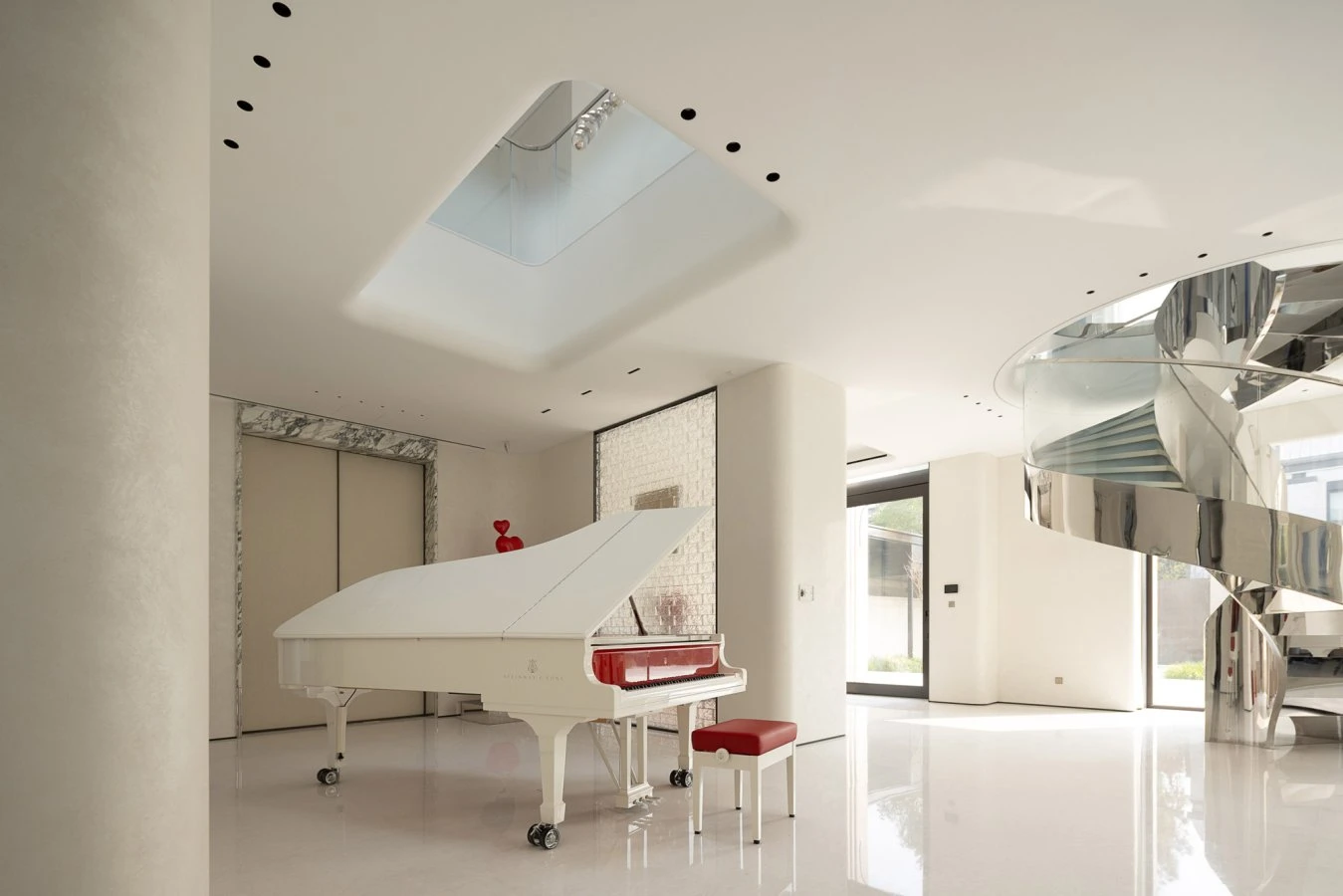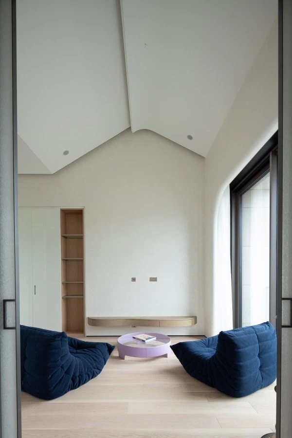 The Shanghai Putuo Kingdom Villa project is characterized by the expert use of light and bright colors, which enhance the sense of openness and fluidity of the spaces. The villa, predominantly dominated by neutral tones such as white and taupe, makes the most of natural light to create airy and expansive environments that give the impression of endless space. Additionally, the presence of smooth and reflective surfaces further accentuates the visual purity of the spaces, creating a timeless atmosphere with a distinctly contemporary character. A distinctive feature is the presence of the spiral staircase, positioned at the center of the main room. This not only serves as a transition element between the various levels of the house but also helps create a dynamic and flowing movement within the surrounding environment.