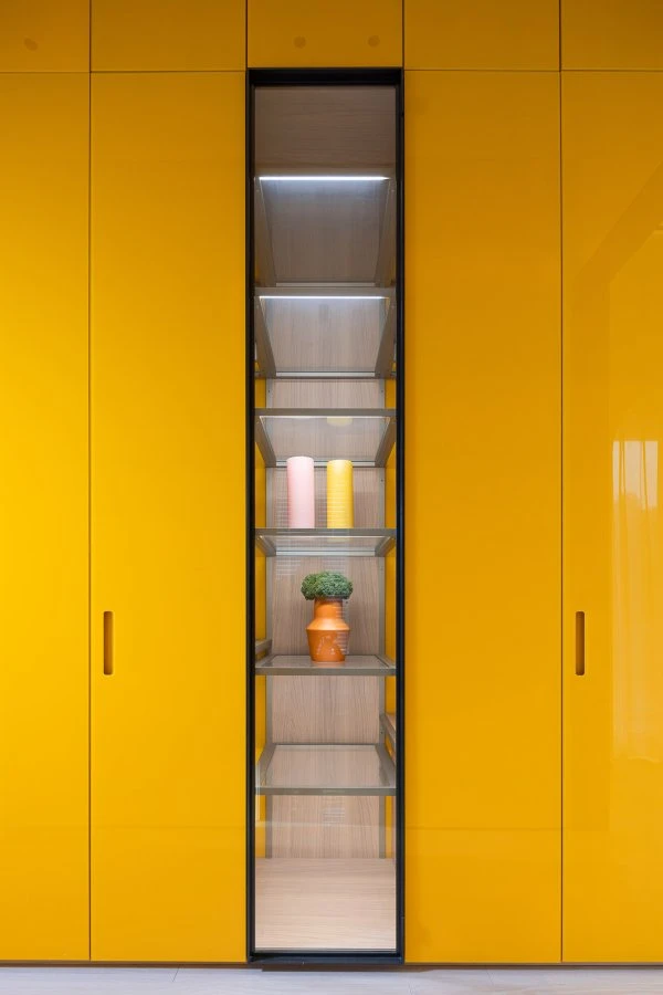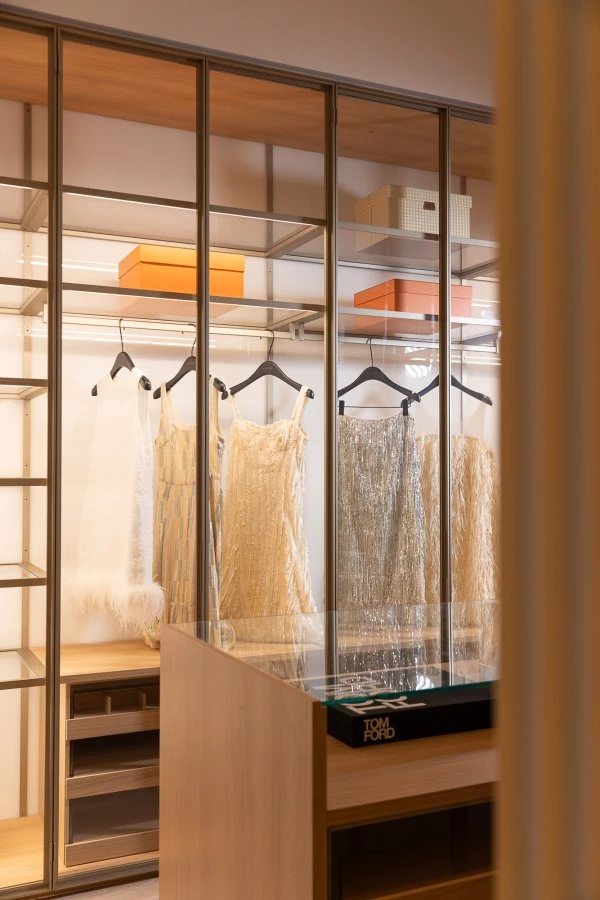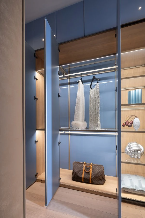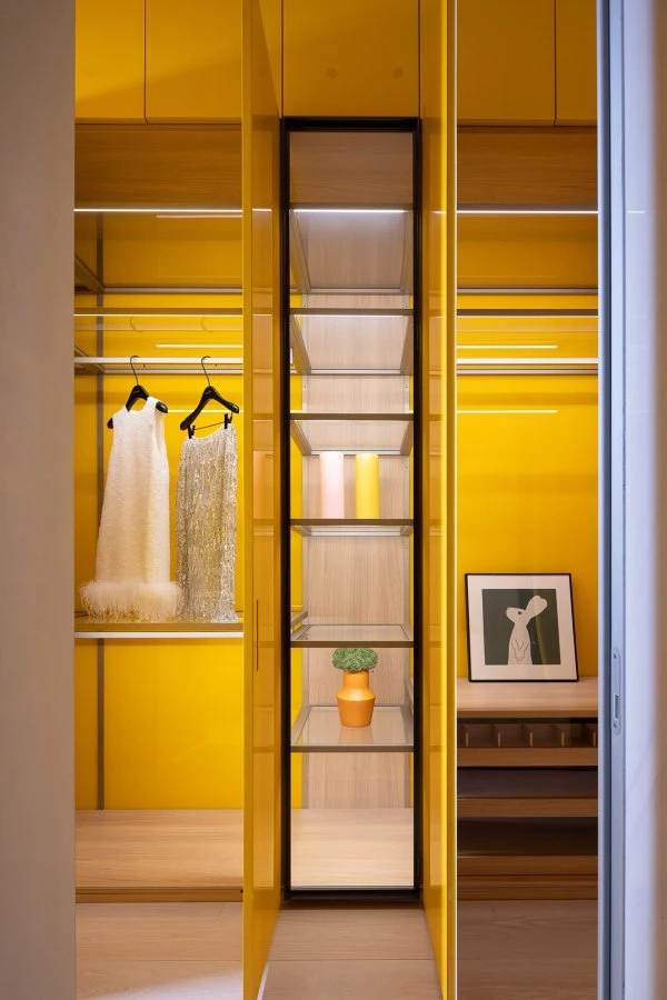 In this bright and open scenario, Porro's Storage wardrobes play a fundamental role. These systems, designed to maximize space usage without compromising aesthetics, are crafted with a white cherry structure, adding a touch of refinement to the interior compartments. The external lacquered finishes come in four color variations: carta da zucchero, giallo zolfo, bianco e tortora. The choice of these colors is not accidental, as each shade was selected to perfectly integrate with the specific characteristics of the spaces where the wardrobes are placed, optimizing the villa's aesthetic cohesion. Special attention has been given to the functionality of the Storage wardrobes near the children’s bathrooms: spacious full-height solutions featuring monochromatic finishes in yellow and light blue, paired with open shelves that showcase the wooden interiors. These colors were chosen not only for their ability to infuse freshness and vibrancy but also for their visual impact, enriching the environment and defining its atmosphere. In the bedrooms, the Storage wardrobes combine lacquered doors in more subdued and delicate colors, such as white and taupe, with open compartments in white cherry wood and transparent, luminous shelves. In the large dressing room serving the master bedroom, the transparent Storage wardrobe with Iron doors and metallic elements in a cuvée finish is placed on both sides. Completing the center of the room is the Storage Isola chest of drawers with a white cherry finish, preserving the visual harmony of the entire project. The modularity of the systems allows for complete customization, adapting to various space and organization needs, whether it be shelves for bags, containers for small accessories, pull-out shelves, or shoe racks, enabling optimal use of the available space.