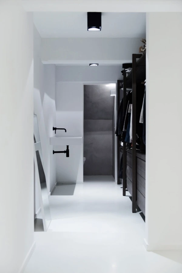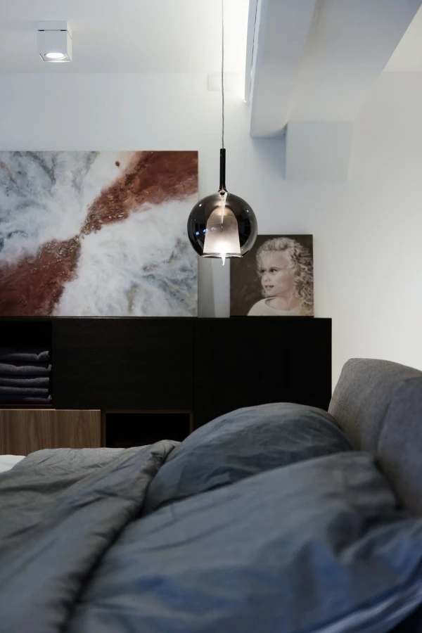 The Shin bed by Piero Lissoni is proposed with a soft welcoming headboard in gray fabric, black stained ash bed frame and black painted steel tubular footboard, with an ascetic simplicity, completed by Truck bedside table by Piero Lissoni. A Modern storage unit designed by Piero Lissoni + CRS Porro mixes and matches essences and colors belonging to the Porro selection, while in the hallway the Storage walk-in closet designed by Piero Lissoni + CRS Porro furnishes the space in the name of geometric purity.