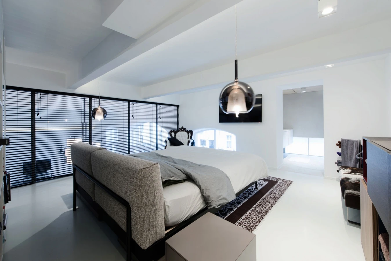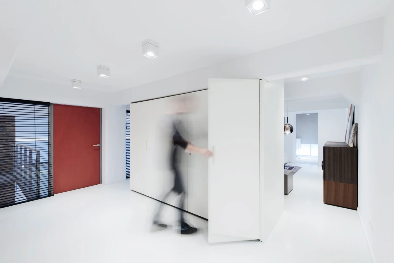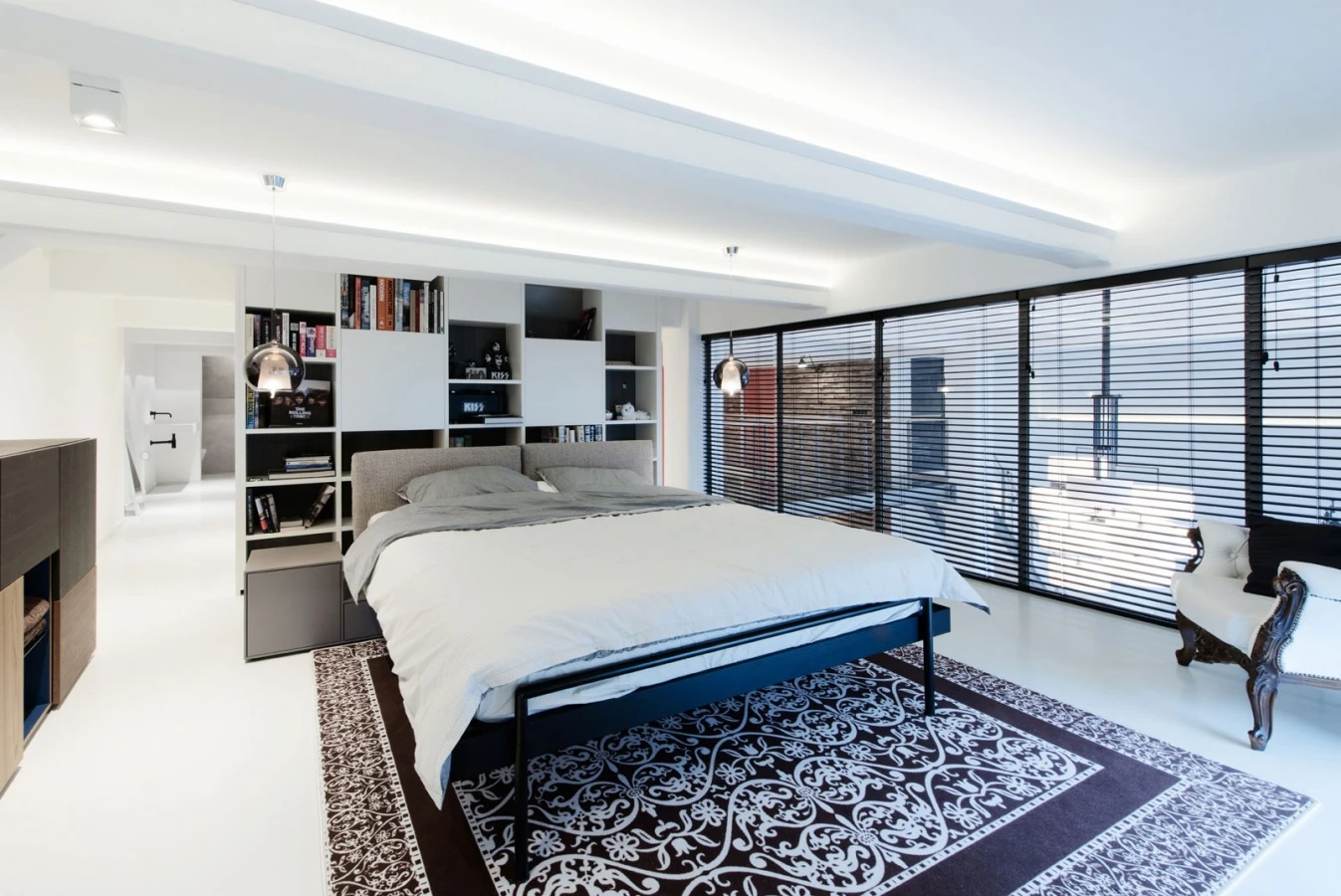 The upstairs bedroom is concealed by a Storage closet designed by Piero Lissoni + CRS Porro with moon white lacquered hinged doors, leaning against a System bookcase designed by Piero Lissoni + CRS Porro that alternates open and closed compartments, acting as a back wall.