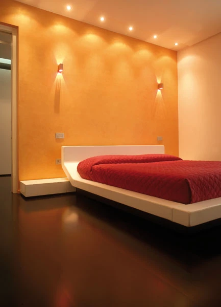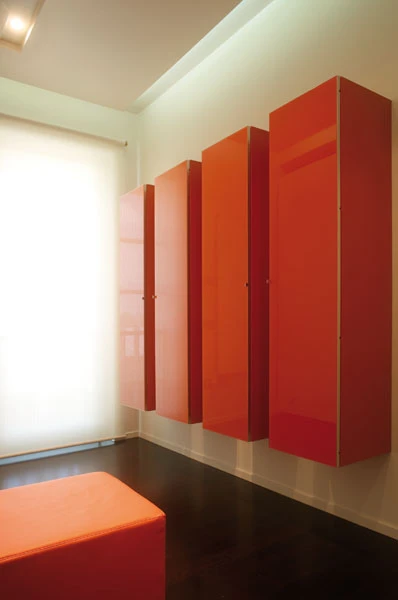 Finally, in the night ambience, the white leather Lipla bed with its unusual broken profile is combined with four Modern wall-mounted vertical units with Mars orange back-painted glass door: a note of colour, taking up the shade chosen to paint the entrance wall of the room, in harmony with the dark wood of the flooring.