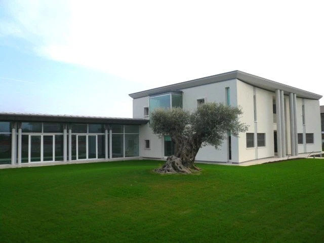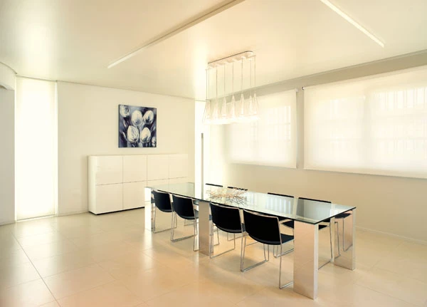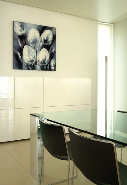 In the dining area , which, if needed, can be used as a more informal and welcoming meeting room, the Beam Glass table with glass top and polished aluminium legs is surrounded by black leather Spindle chairs beside a Modern sideboard with eight doors with push-pull opening and chalk white finish.