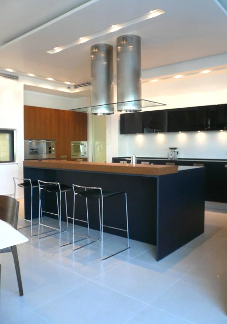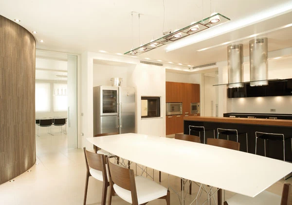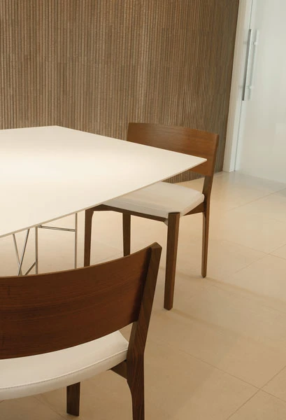 In the kitchen area, alongside the bar counter with its lively Spindle stools, the table Synapsis stands out with its chromed steel rod structure, a transparent and light base from the visual point of view, made even more ethereal by the Pral® top with which it is combined; Como chairs, on the other hand, have seats covered in white leather and Mongoy wood structure, the same warm tone that lines the curved service volume which enlivens the space.