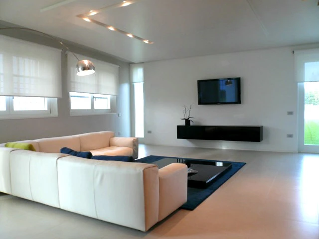 The undisputed protagonist in the living area is Modern, the Porro system of storage units, tops and shelves, proposed in the centre of the room on a square gloss black painted platform and in a wall-mounted unit with folding door, on which the television is positioned.