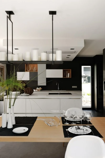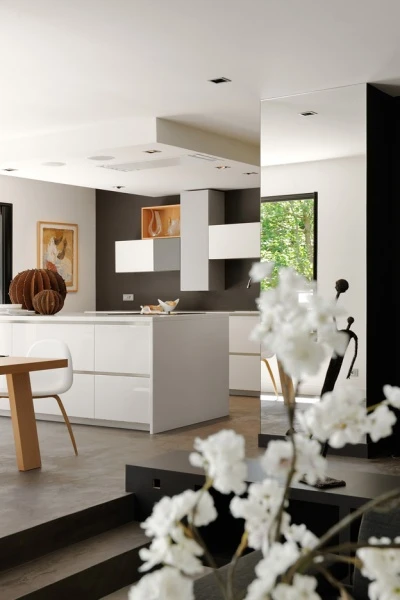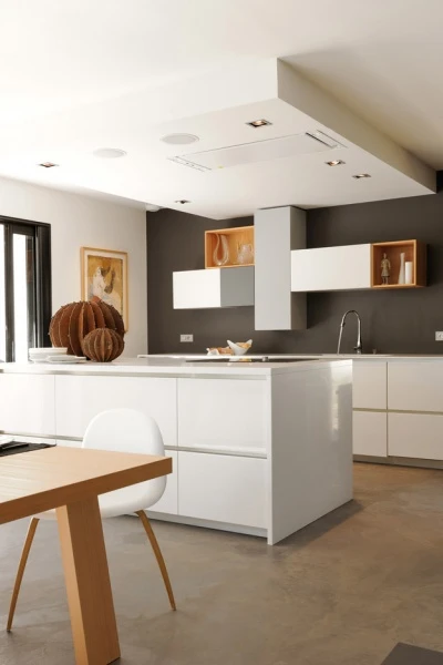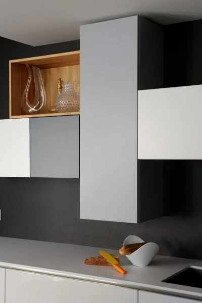 Modern, a system of containers and shelving for living rooms, is showcased in the kitchen in a hanging composition in white to grey colours that add a geometric rigour to the space.
