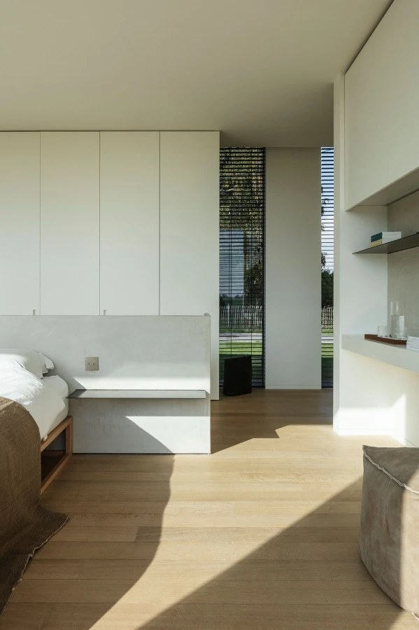 The architectural purity of Storage, Porro’s system of wardrobes open wardrobes and walk-in closets, is the protagonist of the villa built in the Belgian countryside by SD Concepts, historic partner of the Italian brand,
