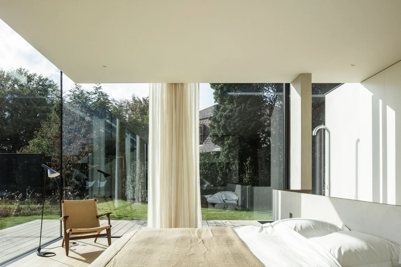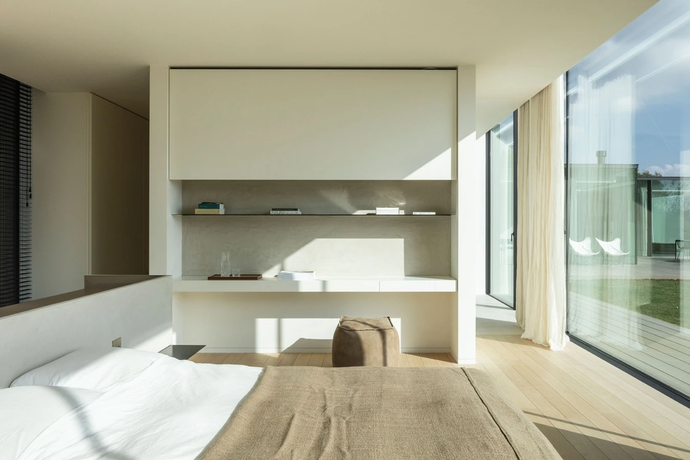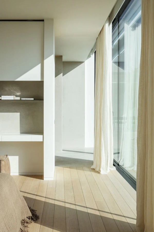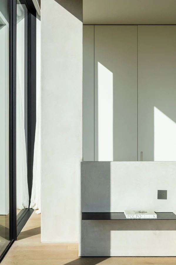 The design of the spaces favors furnishings a palette of neutral colors and white, in a dialogue with the light, which penetrates from the continuous perimeter windows screened only by light curtains or Venetian blinds, defining the ethereal character of the space. the Hinged Storage wardrobe with Boite-Aux handles creates a visual backdrop in the bedroom. The central bed rests on a half-height partition painted in lime, from which minimal shelves that act as bedside tables stand out.