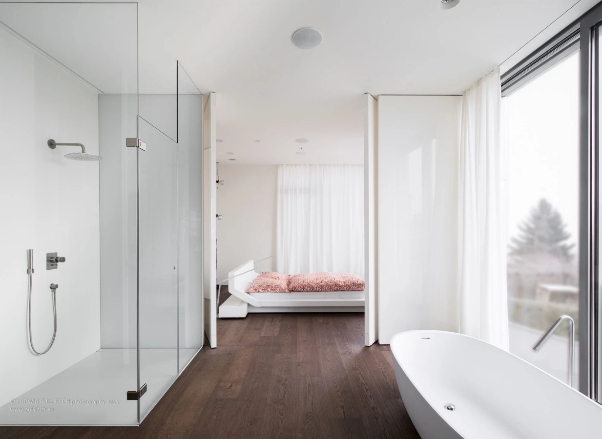 In this intervention they are used to isolate the bathroom from the bedroom, a minimal and essential environment, with a strong geometric component that is even more accentuated by Lipla, the iconic bed signed by the French designer Jean-Marie Massaud for Porro. A composition of lines, surfaces and volumes that creates a unique and compelling harmony.