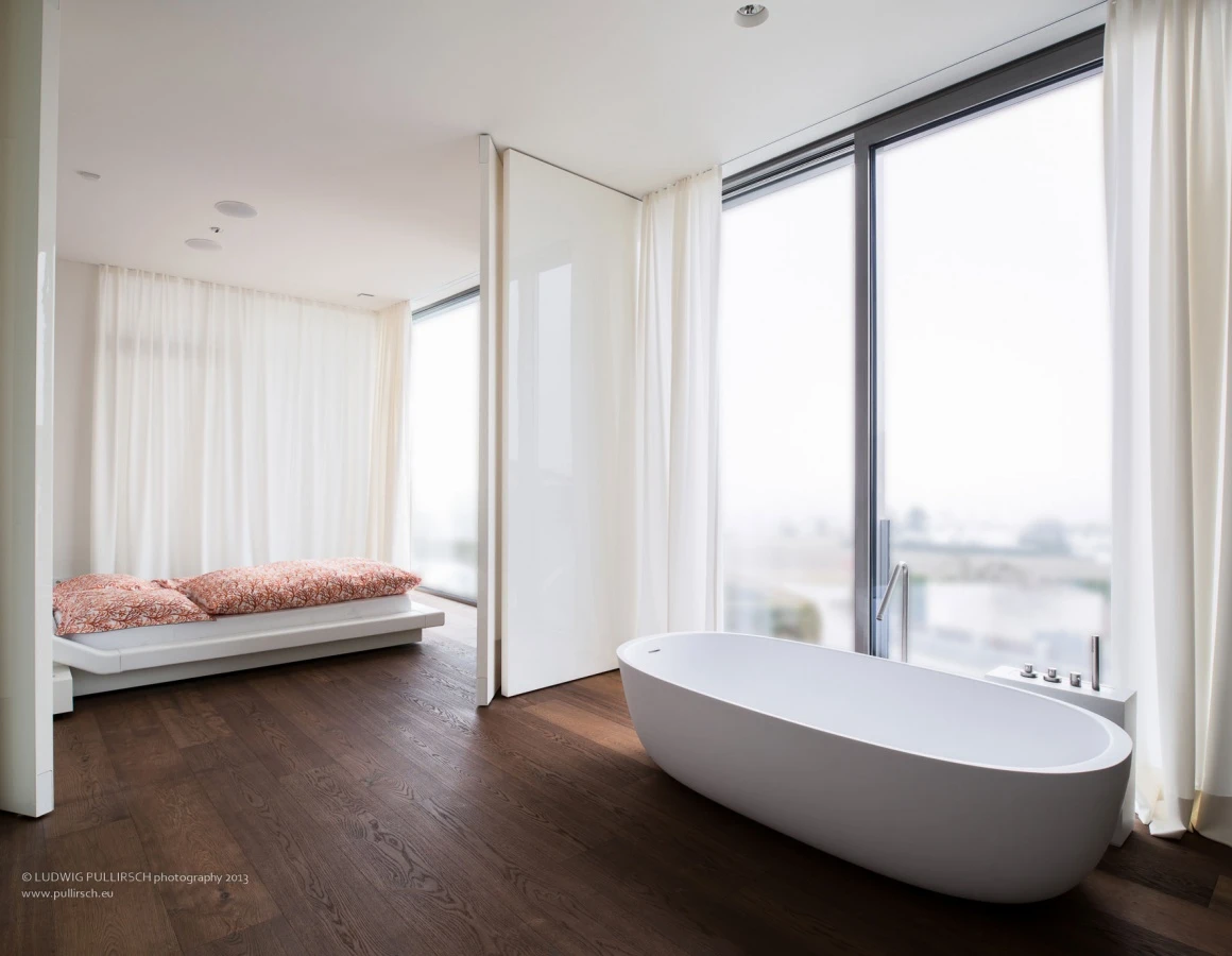A quiet and relaxing space, with a clear contrast between the light tones of the furniture and the dark ones of the parquet. Protagonists of the project conceived by Steininger architects.design for a private home in Vienna, the Pivot doors designed by Decoma Design for Porro: large movable walls that, by rotating around a central pivot, allow to close, screen, divide, but also connect the rooms in a new and more dynamic relationship.