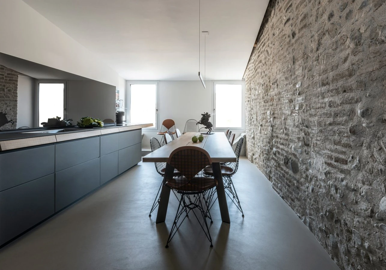 The dwelling, housed inside a long, narrow terracielo building, typical of the Gothic lot, develops along a longitudinal axis from east to west, facing only the two narrowest sides. The intervention consists of a complete renovation that enhances the particular conformation of the house, with openings only on the two short sides (to the west in the master bedroom and to the east in the kitchen).
