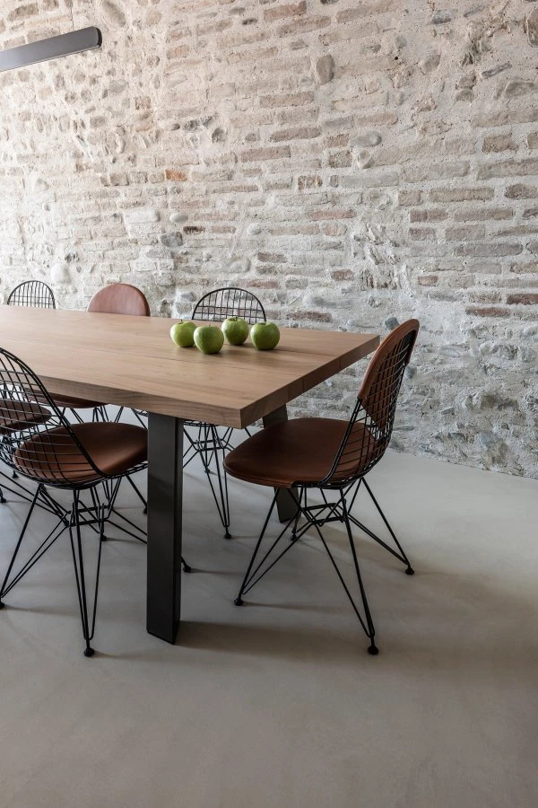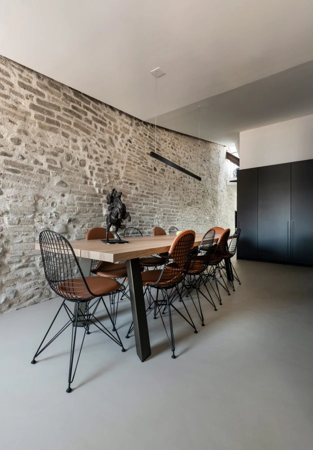 Following the longitudinal line, we first encounter Piero Lissoni's Ryoba table for Porro which, thanks to its long, narrow proportions to respect the natural size of the trunks, fits perfectly into the dining room layout directly connected to the kitchen. The thick triangular legs create an easel on which the substantial top rests, composed of solid wood boards, each slightly different from the other, simply assembled without glue. The table, which invites a new intimate conviviality, responds perfectly to the owner's need to be able to accommodate many guests, despite the limited space. The exposed cracks and tiled knots underscore the poetry of this beautiful traditional wood which takes on a new life and becomes contemporary.