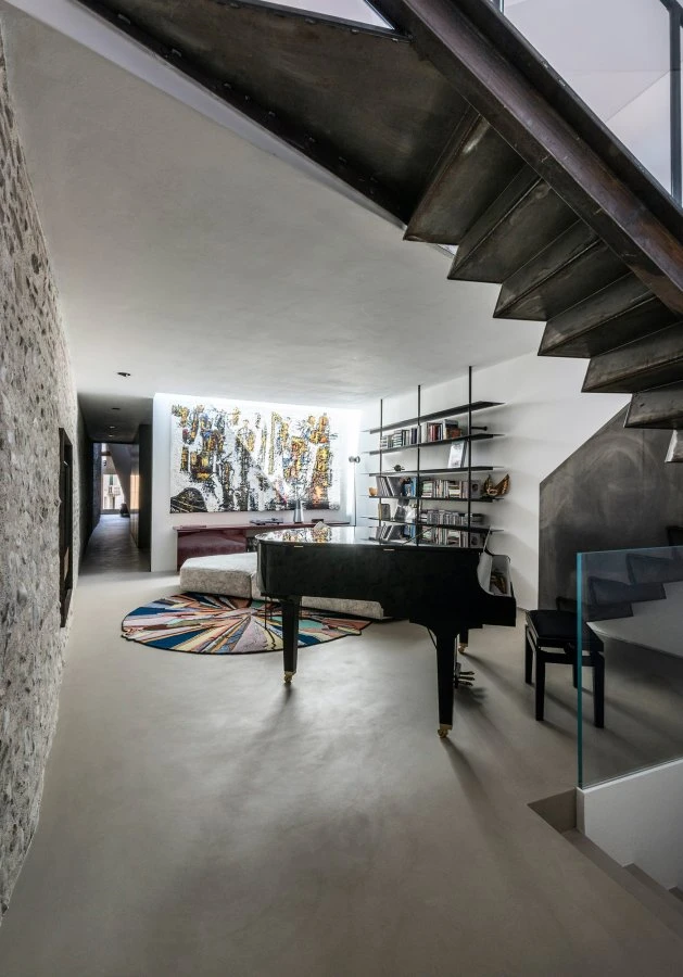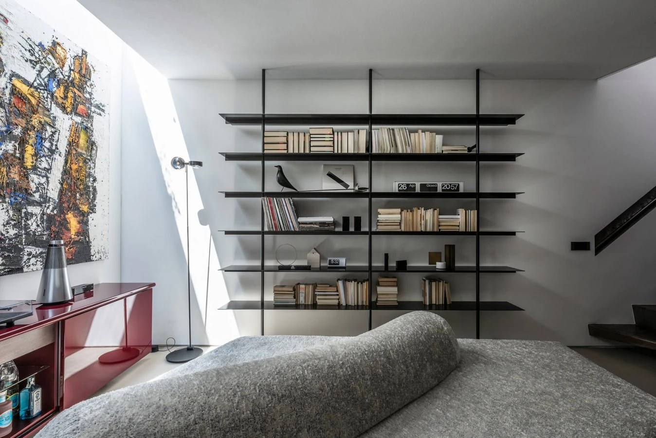 In the living room, the Boutique Mast bookcase by Piero Lissoni for Porro in aluminium completes the room with its lightness and graphic linearity. Characterised by circular metal uprights and large cantilevered glider-wing shelves, this minimal and essential composition creates a fascinating contrast with the striking stone wall that extends throughout the house.