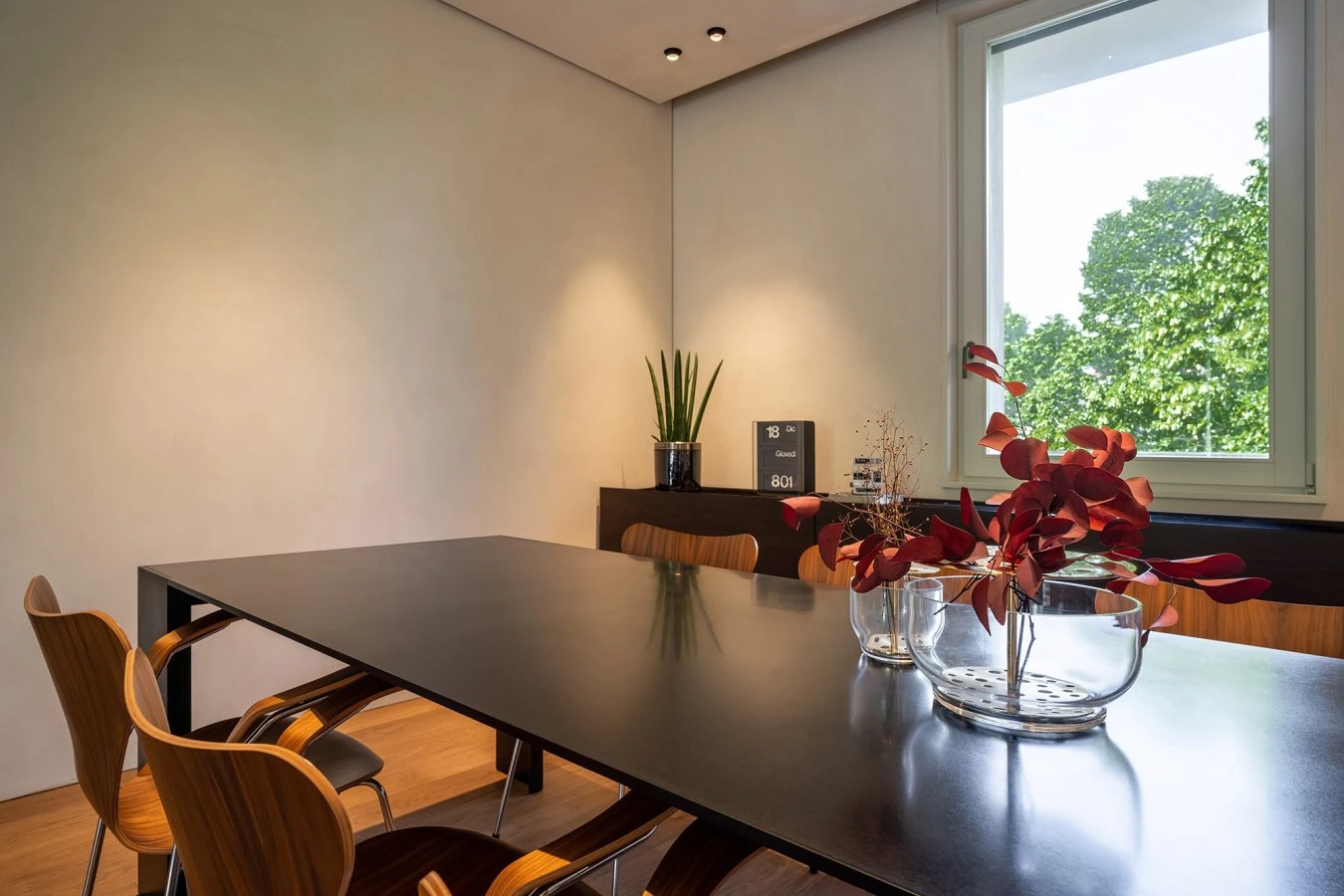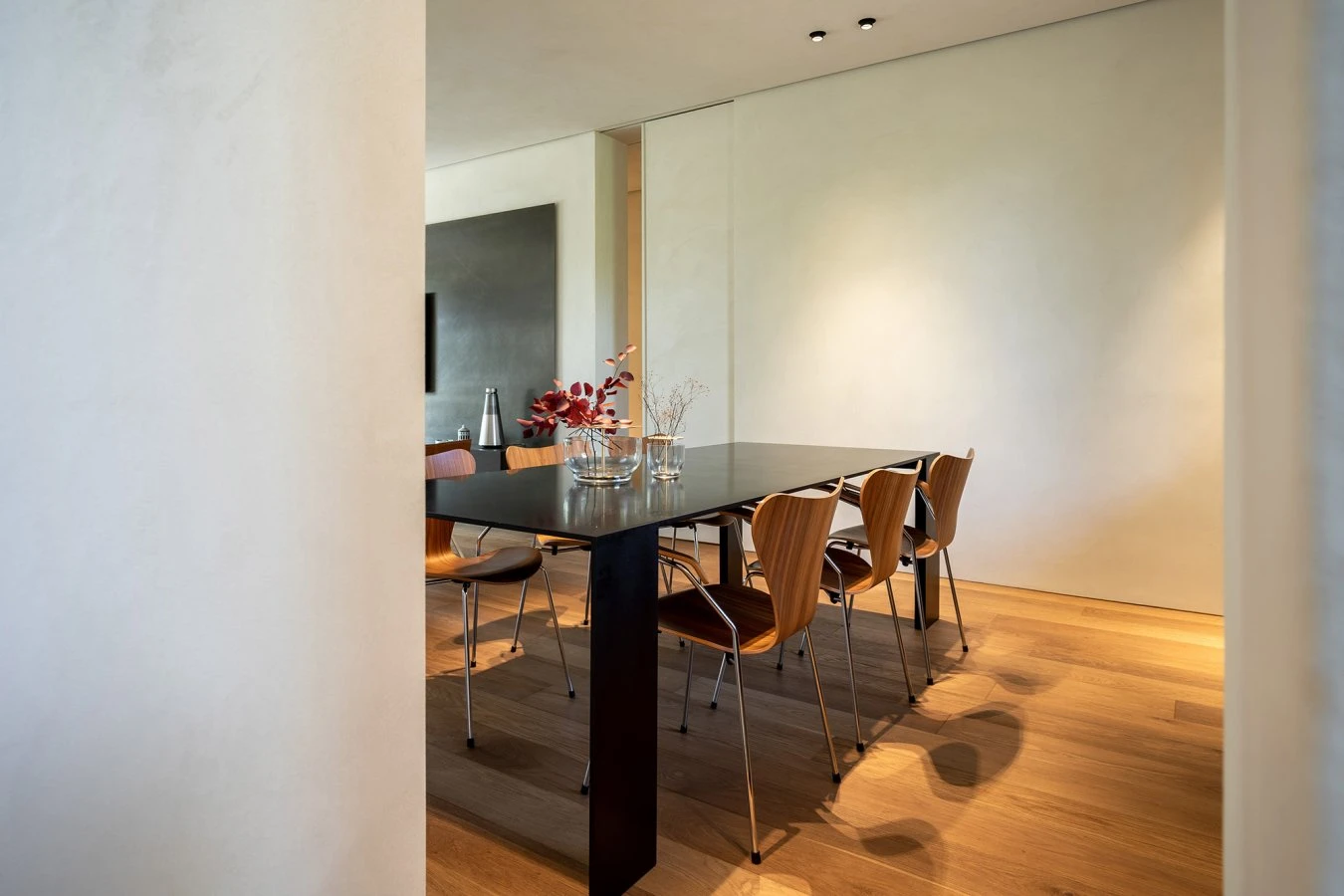 The core of the house is the large and bright living and dining area, dominated by the large Metallico table by Piero Lissoni for Porro, made entirely of hand-brushed black aluminium. The table's simple, linear design is distinguished by the lightness of its top and legs, made of 12 mm thick aluminium sheet. The solid aluminium gives to this essential project with delicate aesthetics but materially consistent as well, solidity and lightness, besides being ecological.