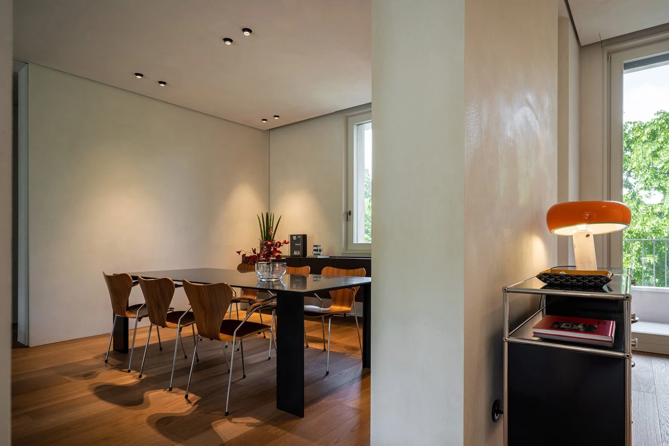 The geometric purity of Porro design is the protagonist in the dining room of a flat renovated by Blank Design, an architectural design studio and furniture showroom led by architects Valeria Piras and Michele Morelli. Located in a central and exclusive area of Parma, the flat is in a small residential condominium consisting of a few units. The intervention involved a complete renovation that involved the flat from both a structural and plant engineering point of view.