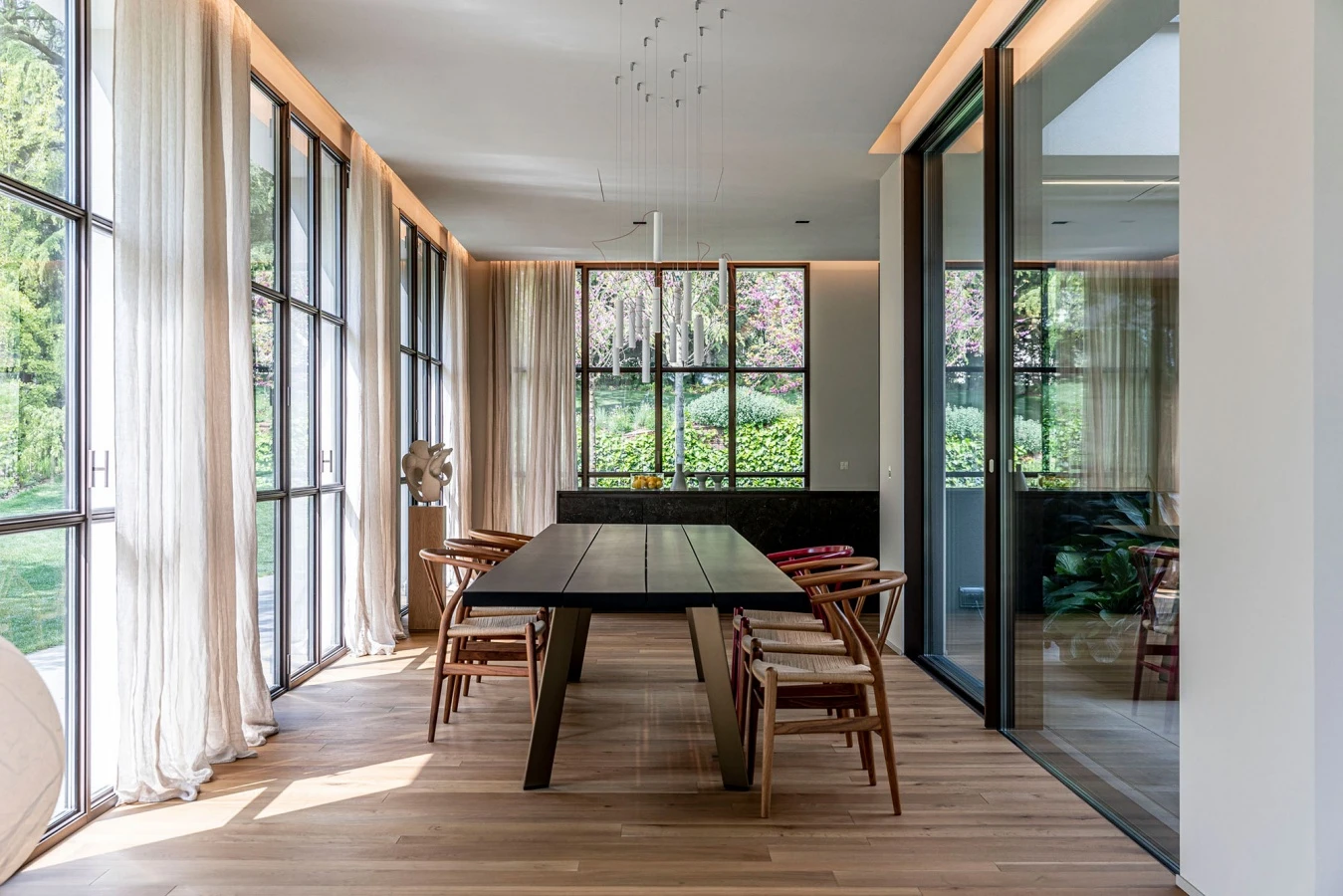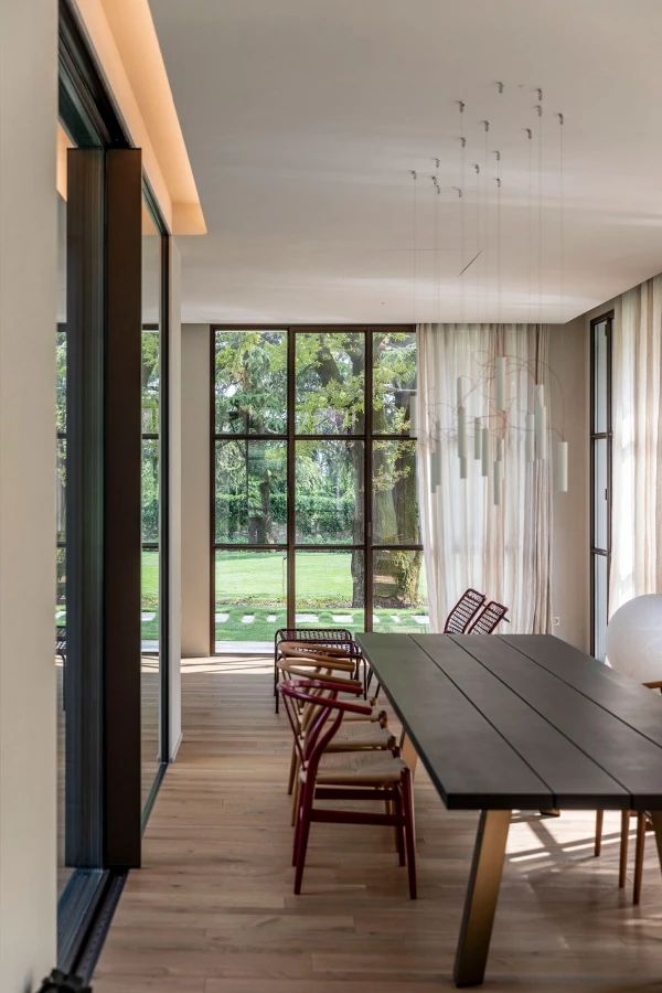 Large industrial windows overlooking the outdoor garden and the inner courtyard frame the dining room, gathered around the Ryoba table by Piero Lissoni for Porro in an atmosphere of peace and tranquility. A tribute to the naturalness of materials and the beauty of imperfection, Ryoba stands out for its triangular-section legs in brass-effect anodized extruded aluminum that create a trestle on which the material top rests, 4 solid black stained cherry wood planks, slightly different from each other, simply dry-assembled with a thin joint. The Franciscan proportions of the table, narrow and long to respect the natural size of the trunks, invite a new, intimate conviviality, while the splits left visible and the knots doweled underline the poetry of this beautiful traditional wood, which takes on new life and becomes contemporary.