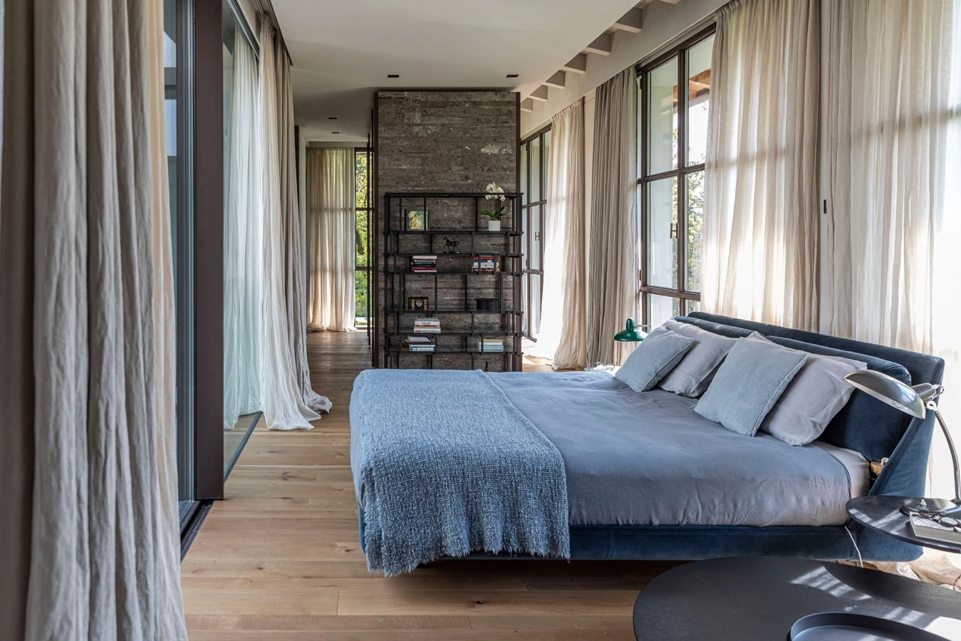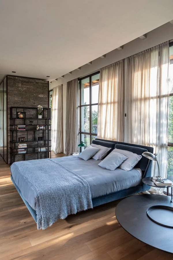 In the bedroom on the upper floor, protected from view by long curtains, the eye is caught by Piero Lissoni's Makura bed in a delicate powder-blue fabric. Suspended from the floor, Makura interprets a new concept of domestic warmth, between rationality and sensuality, with its welcoming and inviting shape thanks to the sinuous and enveloping headboard and the presence of comfortable removable cushions. The attention to detail that characterizes Porro’s products is found in the soft curve that connects the headboard and bed frame.