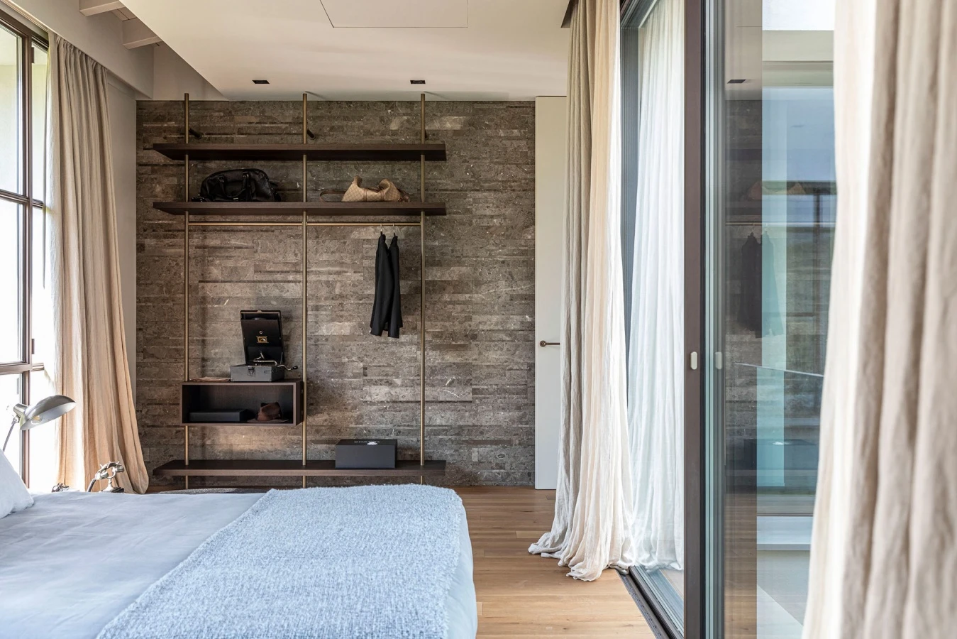 Boutique Mast, Porro’s walk-in closet designed by Piero Lissoni + CRS Porro, with nautical lightness and graphic linearity, allowing maximum freedom of expression for floor-to-ceiling compositions, shows its elegant on the wall versatility by offering shelves, hangers and visible containers. Inspired by the masts of a boat, Boutique Mast is characterized by circular section metal uprights in burnished brass on which large cantilevered shelves are applied. Between the vertical sequence of metal elements, and the horizontal sequence of projecting wooden elements, it is possible to insert free compositions of open modules or closed containers, preciously finished with a 45° cut, for a geometric composition of lines and volumes that stands out on the stone wall.