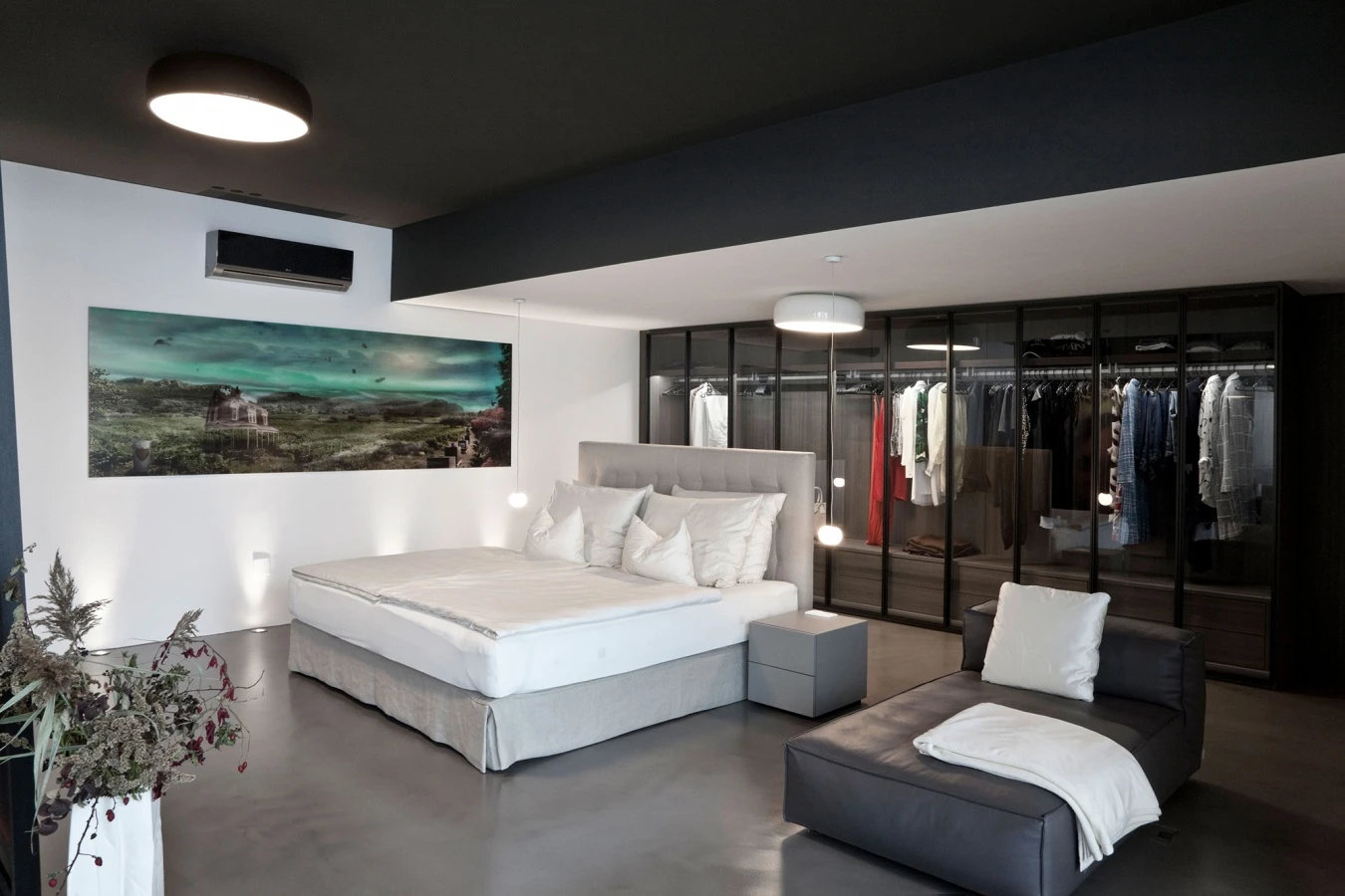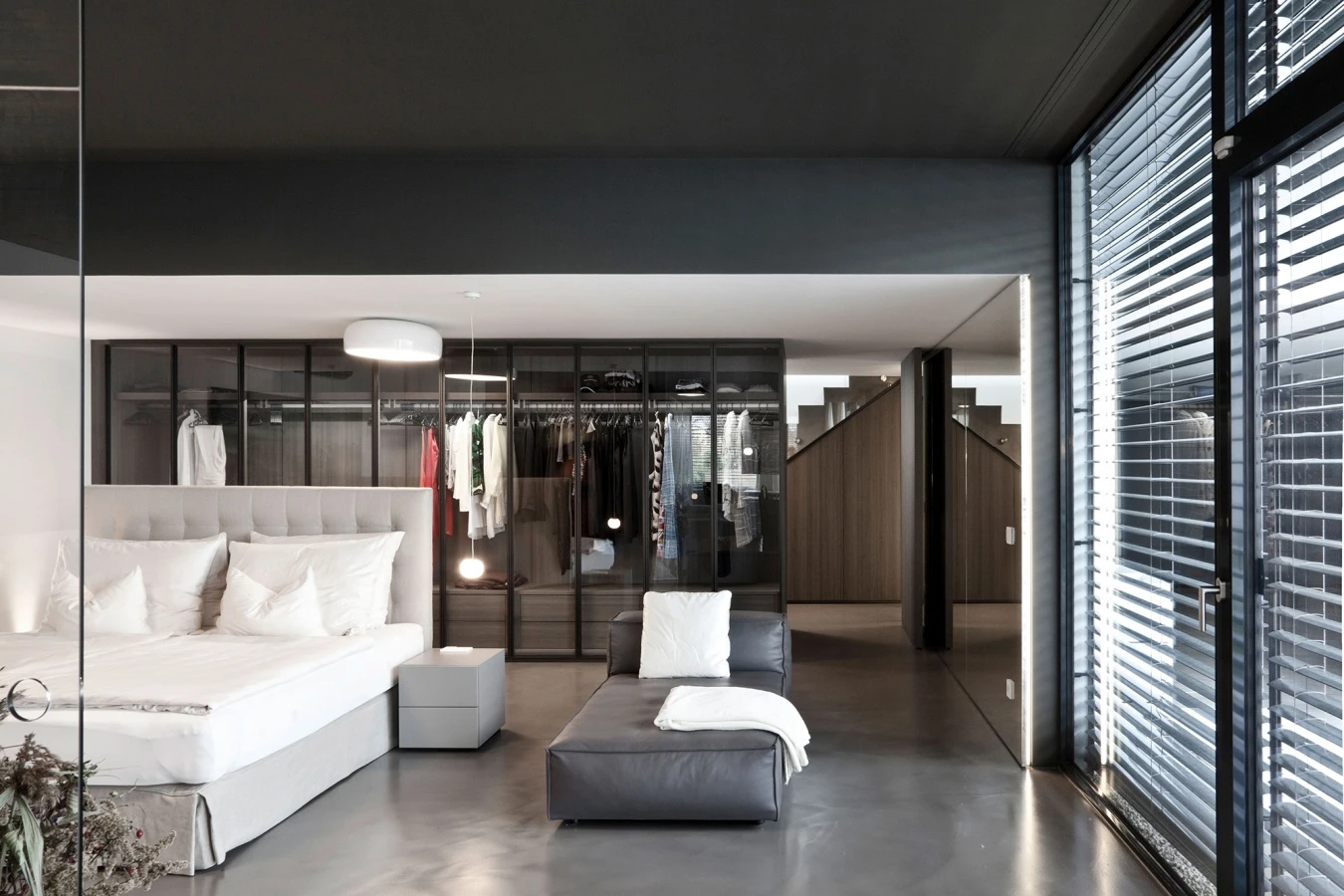 Each space represents a different world, a key concept in the creation of this apartment conceived by Steininger.designers, which uses the Hinged Storage wardrobe designed by Piero Lissoni for Porro as a separating element between the bedroom and the living room. The system also acts as a showcase for the clothes, which are exposed thanks to the transparency of the Iron glass doors that allow you to see inside them. Articulated in two levels, an upper level with a clothes rods and a lower one with a double row of drawers, Storage creates a precious backdrop, in the warm and refined nuances of eucalyptus.