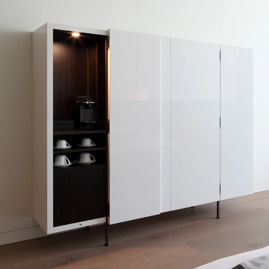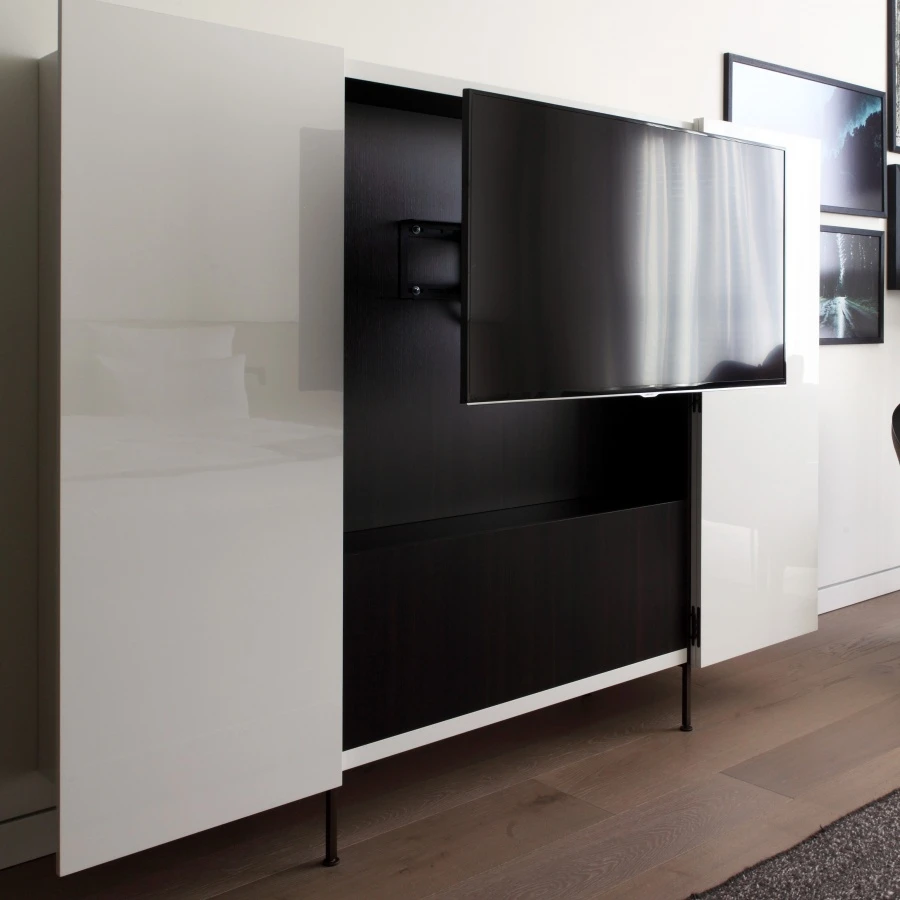 Simplicity, balance and symmetry distinguish the Groove bench in natural hemlock solid wood: the seat is made up of a horizontal table, raised on two inclined supports inserted into a joint. With a white shiny lacquered structure and equipped as a functional and elegant TV cabinet, the Tiller sideboard has 4 doors that open one on the other at 180 °, a feature that nicely varies its façade design, demonstrating the technical ability of the brand, capable to experiment with new opening systems and technologies. Finally, the star of Porro’s offer, the Boutique Mast walk-in closet is an elegant graphic cage characterized by circular metal uprights with a reduced section on which it is possible to apply mirrors and large cantilevered "glider wing" shelves. Light and airy, it is a solution with a high aesthetic impact that in the sleeping area becomes a minimal walk-in closet for a boutique or for a hedonist's house, and in the living room a container, a writing desk and a large bookcase.