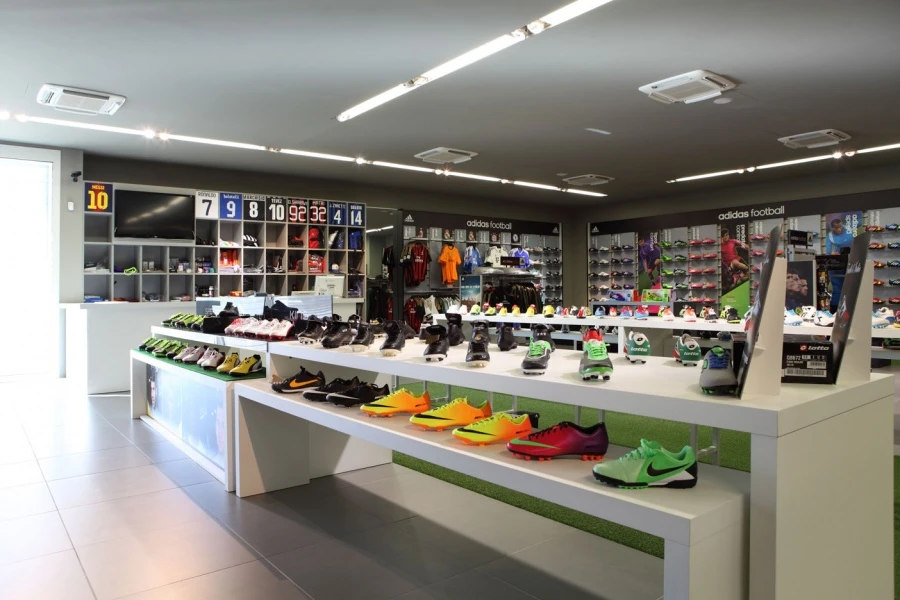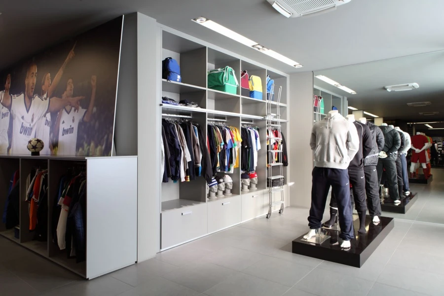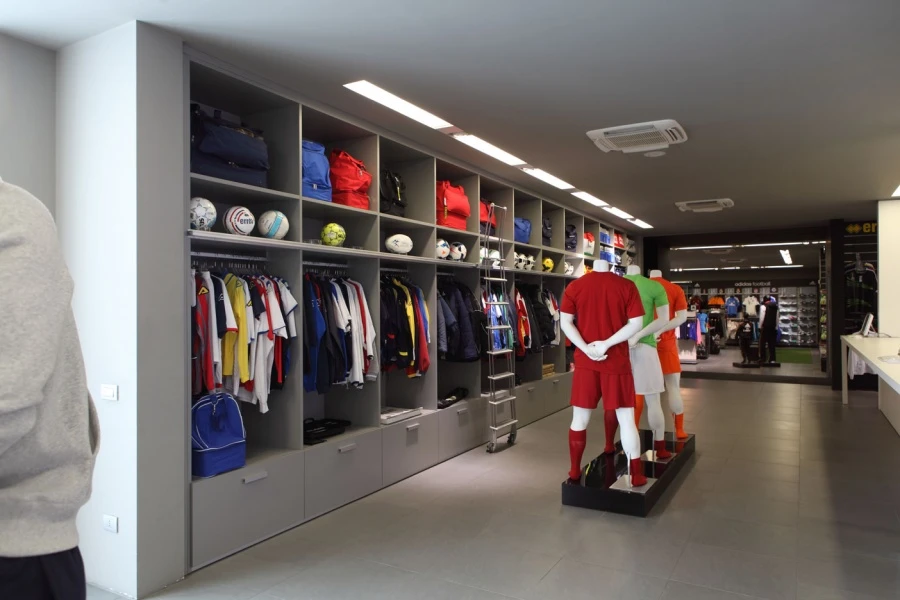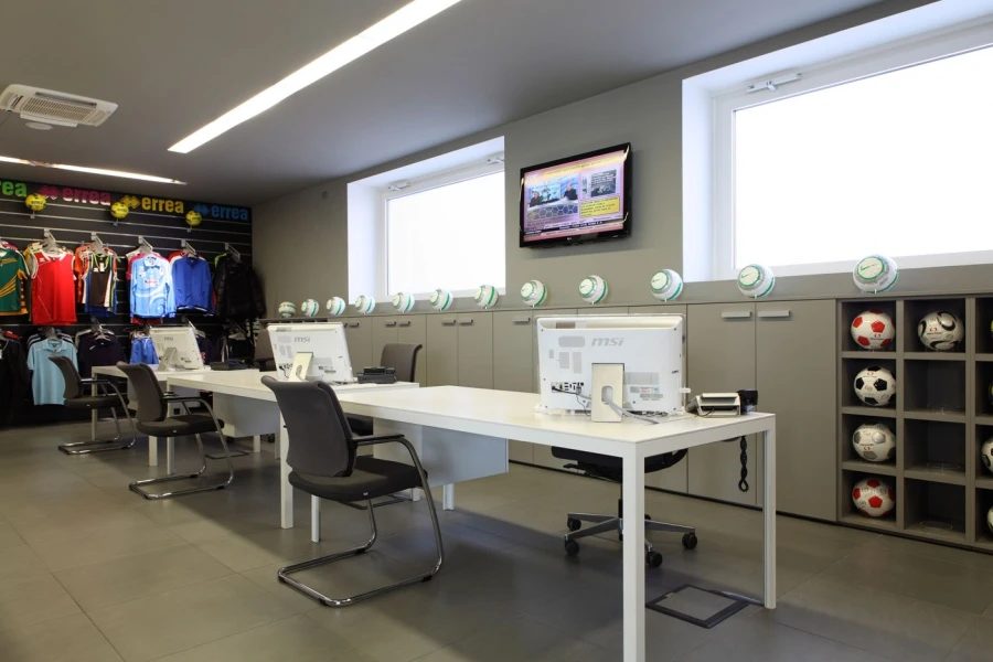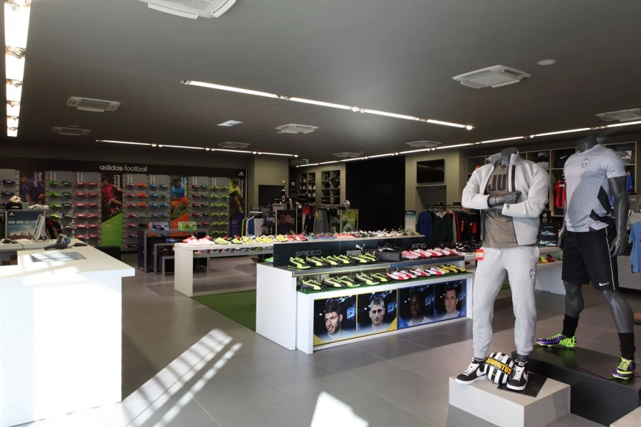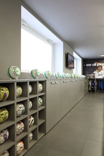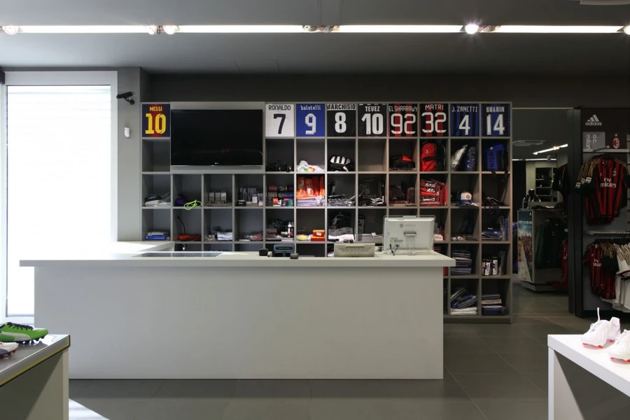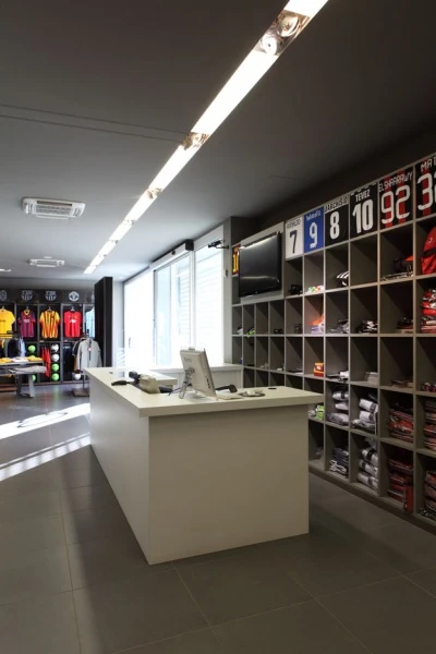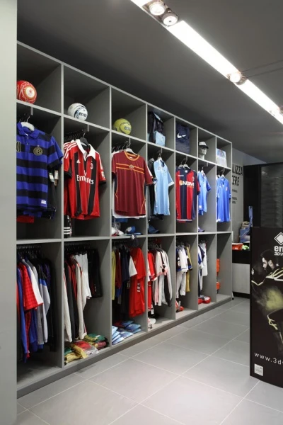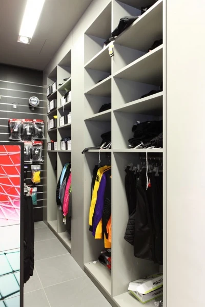 In the first room at the entrance, behind the white tailor made reception desk, stands out the eyecatching design with square modules of Storage system in grey melamine, a customized coloured chosen for this shop, where the T-shirts of the great football champions are exposed. Large tailor made white tables in two heights show different models of shoes at the center of a series of sports shoes in a succession of bright colors. On the walls, a first storage open cabinet in melamine gray is presented with vertical instead of horizontal clothes rods and top shelf for balloons, bags and sunglasses, while the second Storage open closet is declined in 4 orders of shelving offering more inner space.