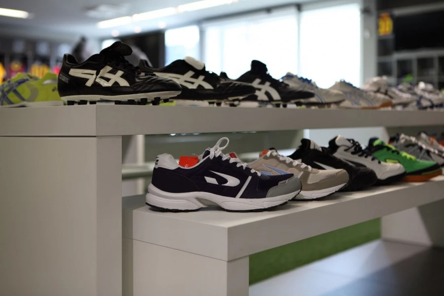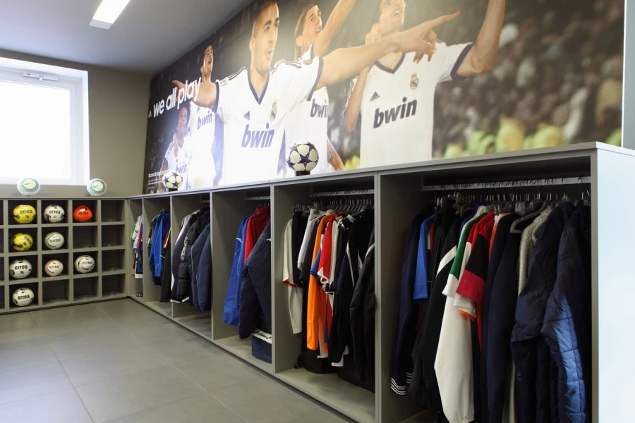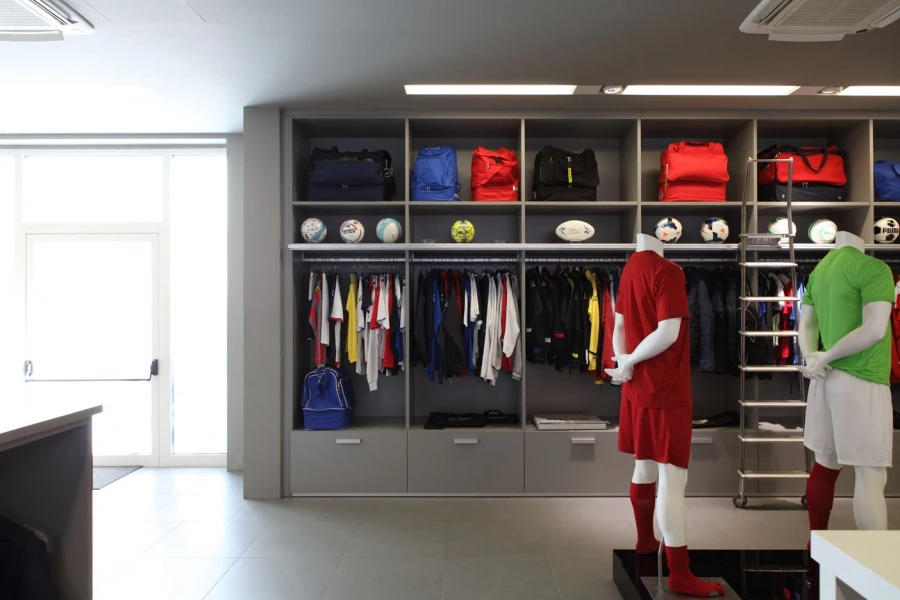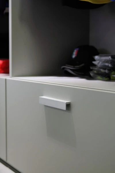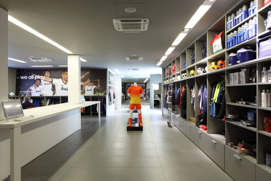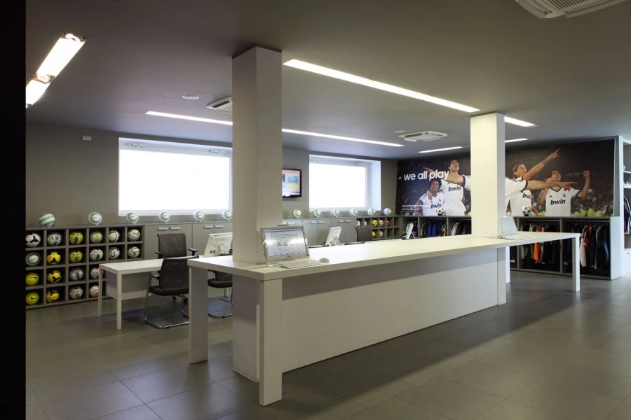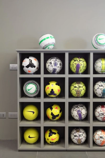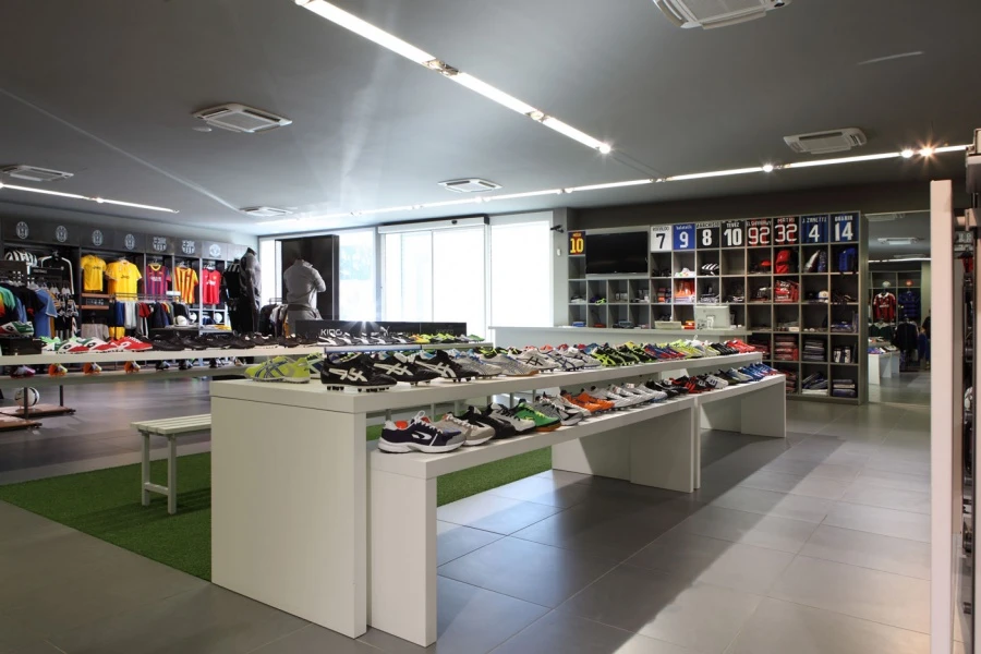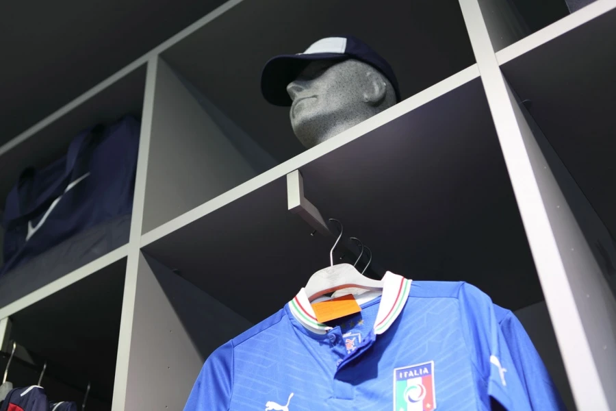 In the first room at the entrance, behind the white tailor made reception desk, stands out the eyecatching design with square modules of Storage system in grey melamine, a customized coloured chosen for this shop, where the T-shirts of the great football champions are exposed. Large tailor made white tables in two heights show different models of shoes at the center of a series of sports shoes in a succession of bright colors. On the walls, a first storage open cabinet in melamine gray is presented with vertical instead of horizontal clothes rods and top shelf for balloons, bags and sunglasses, while the second Storage open closet is declined in 4 orders of shelving offering more inner space.