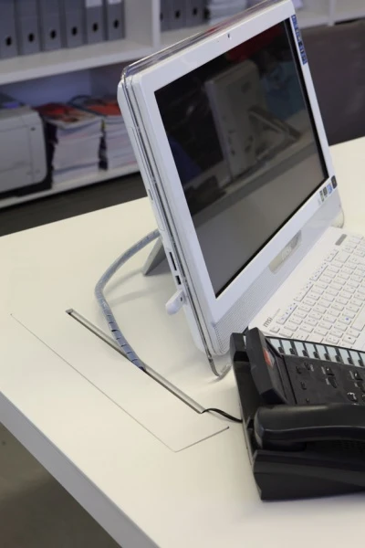 In the central aisle, a tailor made white counter separates an equipped wall on the right, characterized by a big composition of Storage with ladder, open shelves and lower drawer, from the office area on the left. Here, 3 Fractal tables with white aluminum structure and high resistance moon white matt lacquered top are chosen with personalizations for working use, such as hanging drawer, undertop storage unit, top access, leg for cable passage, while on the background a great corner composition of gray melamine Modern alternates open shelves displaying balls, doors with L handle and open spaces with hanging rod. A Modern open container in white HDS is used to archive files.