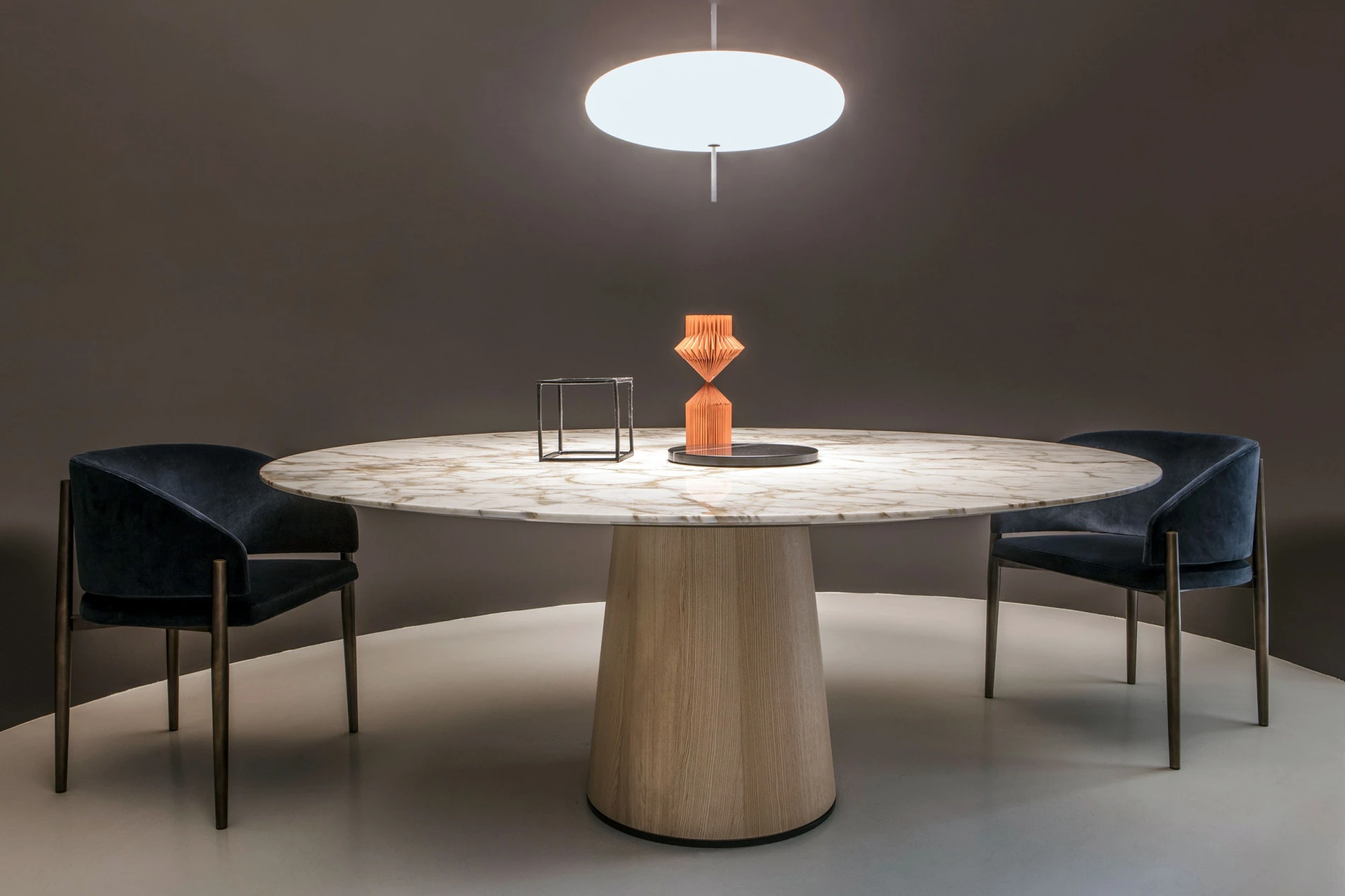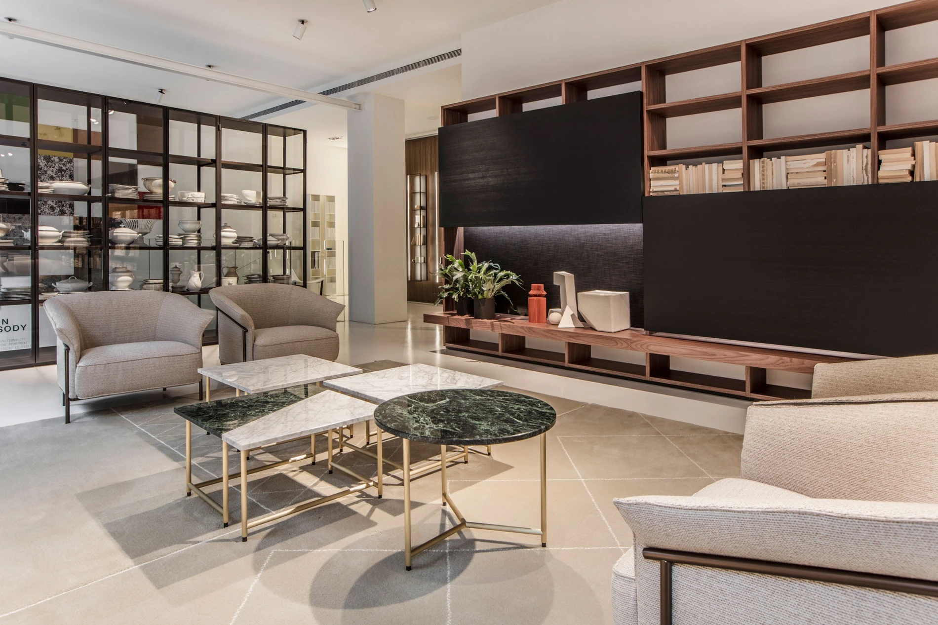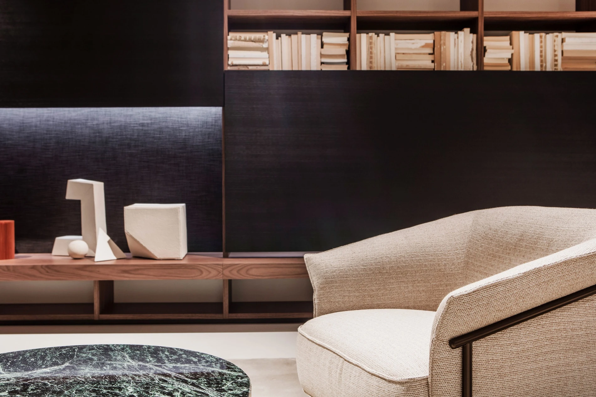 In harmony with a new aesthetic that loves to be daring and experiment with colors, in the central living environment the Ex-Libris bookshelf and glass cabinet by Piero Lissoni renews itself, donning Block doors in transparent glass with lock, baseboard and top in the new Black Sugi melamine finish, and new tray shelves in eucalyptus with royal blue lacquered inside. Around the Palladio coffee tables by GamFratesi which, with their marble tops combine in an interplay of shapes and colors, one can sit comfortably on the Kite armchairs by GamFratesi with their tubular black painted steel structure and beige linen fabric coverings, with an evergreen look and a timeless charm conceived to live just as well in a vintage home as in the lobby of a luxury hotel. The System bookcase in Canaletto walnut, designed by Piero Lissoni + Porro Research centre, astonishes with its visual lightness, showing off its new wide module marked by the new electrified Lift vertically sliding doors in black stained hemlock which, rising up, reveal the fabric covered back panel, and by the new display case with transparent doors and shelves and the new metallic bookend modules.