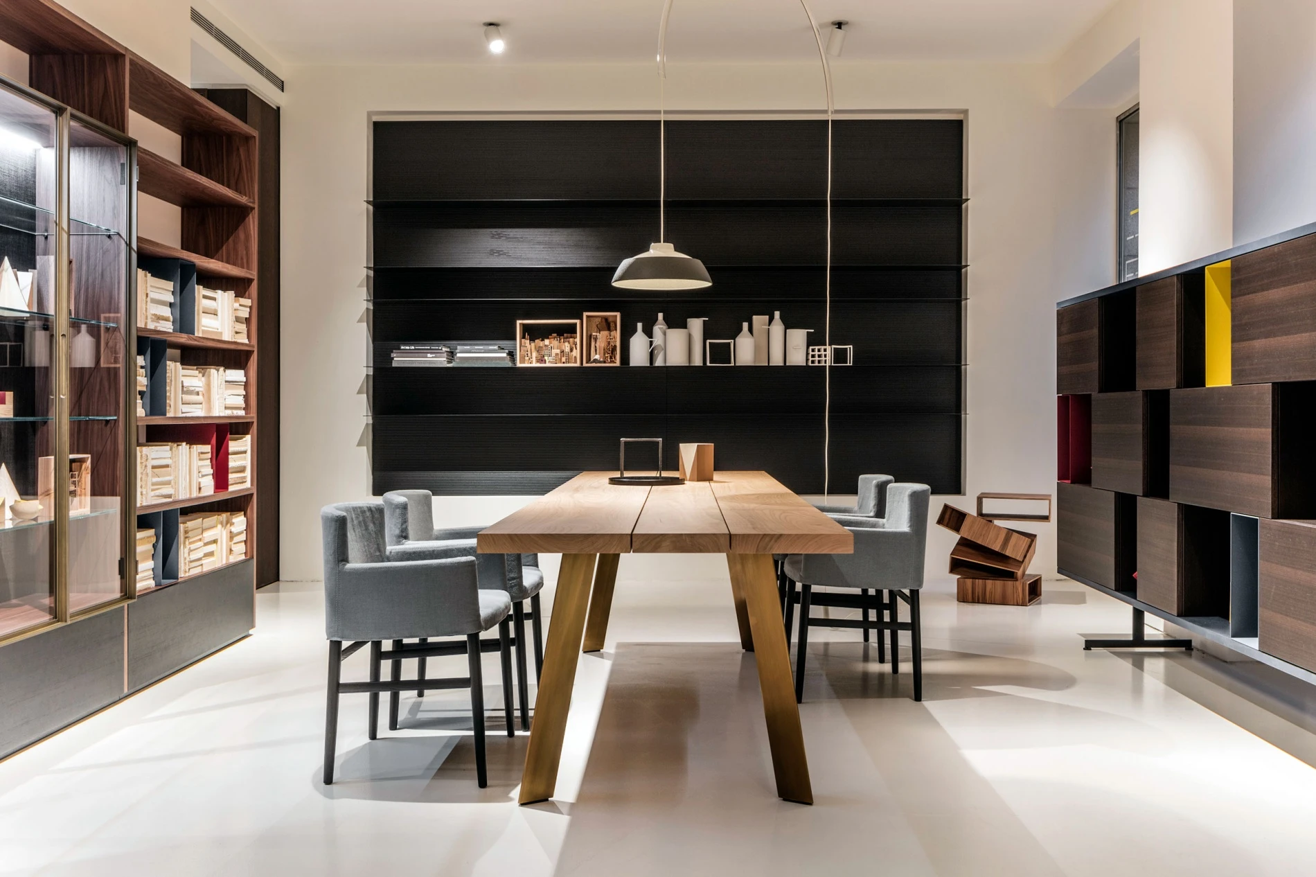 In the dining room, the new Ryoba table by Piero Lissoni encourages a new domestic rituality with its tapered brass legs and a top composed of solid European cherry boards assembled without glue, characterized by long, narrow proportions and irregular format which do not force the natural dimensions of the trunk, matched with the upholstered Pioggia chair by Piero Lissoni with its streamlined solid ash legs and powder blue fabric covering which wraps the seat and armrests. Elevated on the new T-shaped metal foot, a new generation Modern cupboard designed by Piero Lissoni + Porro Research centre encloses, between 2 solid aluminum tray shelves in a special materical blue finish, a freestanding arrangement of wooden boxes in eucalyptus and giallo mustard, rosso cina and blu reale metal modules, in which even the voids become part of the compositional rhythm. On the wall we find a classic piece like the Load-it bookshelf by Wolfgang Tolk, which takes on a new life donning wall panels in the new ribbed wood texture which dematerializes the boundaries of each module, creating a single enchanting 3D surface.