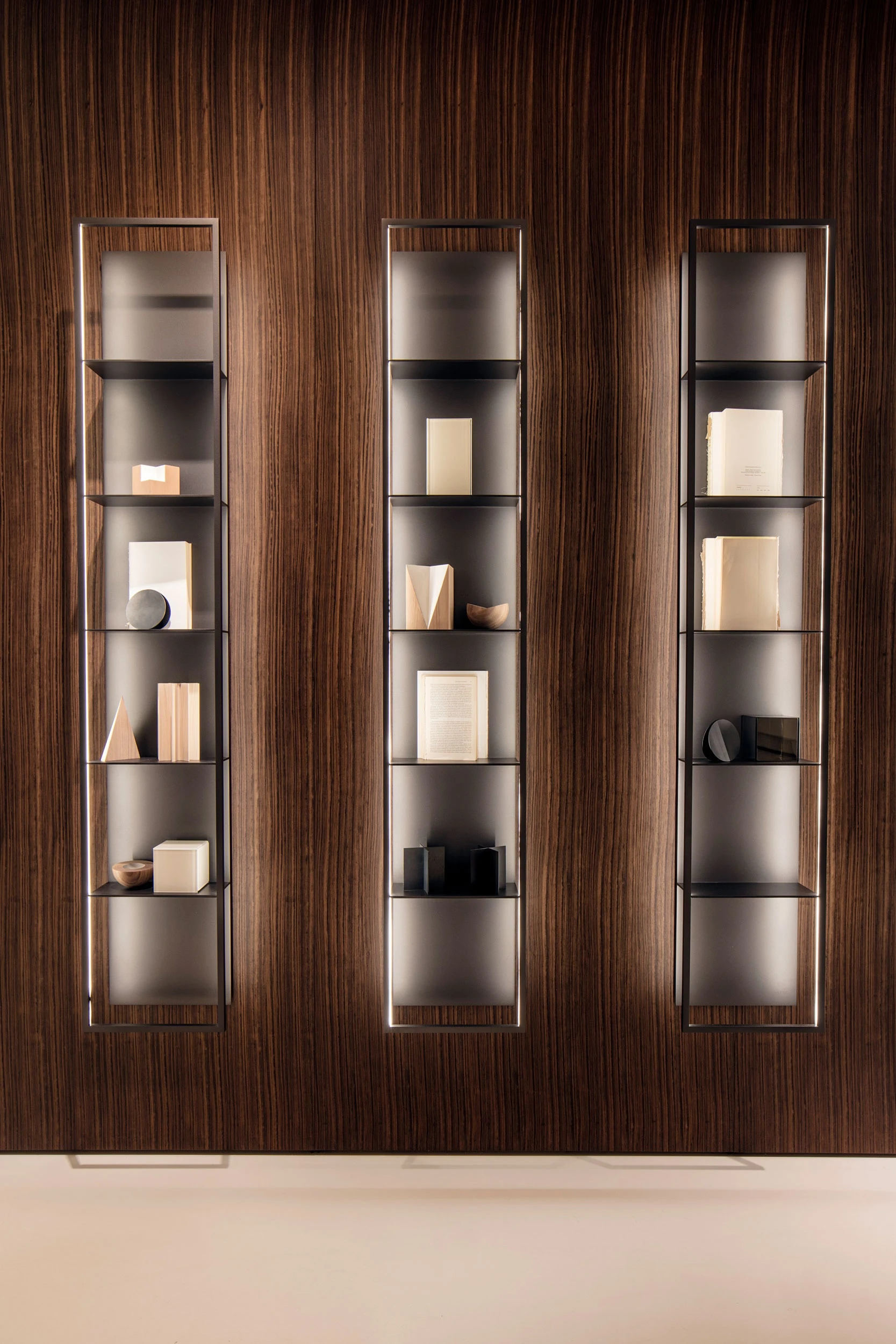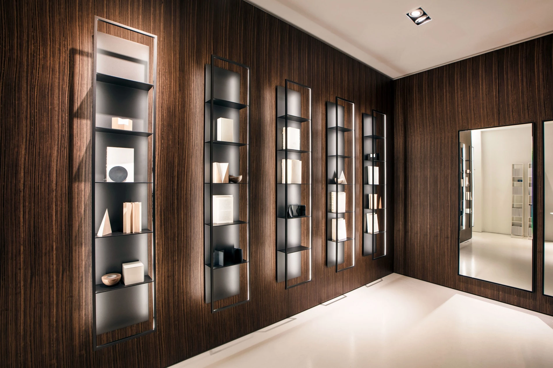 Presented together with the 3Table coffee tables by Front, with shelves in different shapes and materials which rotate around each other, the new Curry couches by Piero Lissoni enchant with their asymmetrical silhouette and the relaxed “buen retiro” atmosphere with the precious workmanship of the woven straw back and the soft cushions in colored linen, which make them ideal in a living area, just as in a bedroom or on a patio, for both residential and contract use. In a continuous interplay of contradictions and opposites which collide and harmonize with each other, a large Modern composition combines a transparent display case with glass doors and shelves with a long sideboard in eucalyptus resting on a 20 cm. T-shaped foot. Opaque and transparent, they interweave in the Hinged Storage wardrobe with Block glass doors, characterized by a metallic contour of refined simplicity which displays fabric covered back panels in tortora linen. A vanity niche has been carved out from among its modules to dedicate oneself, created through a Modern + Load-it composition with mirror wall panels and a black stained hemlock suspended shelf.
