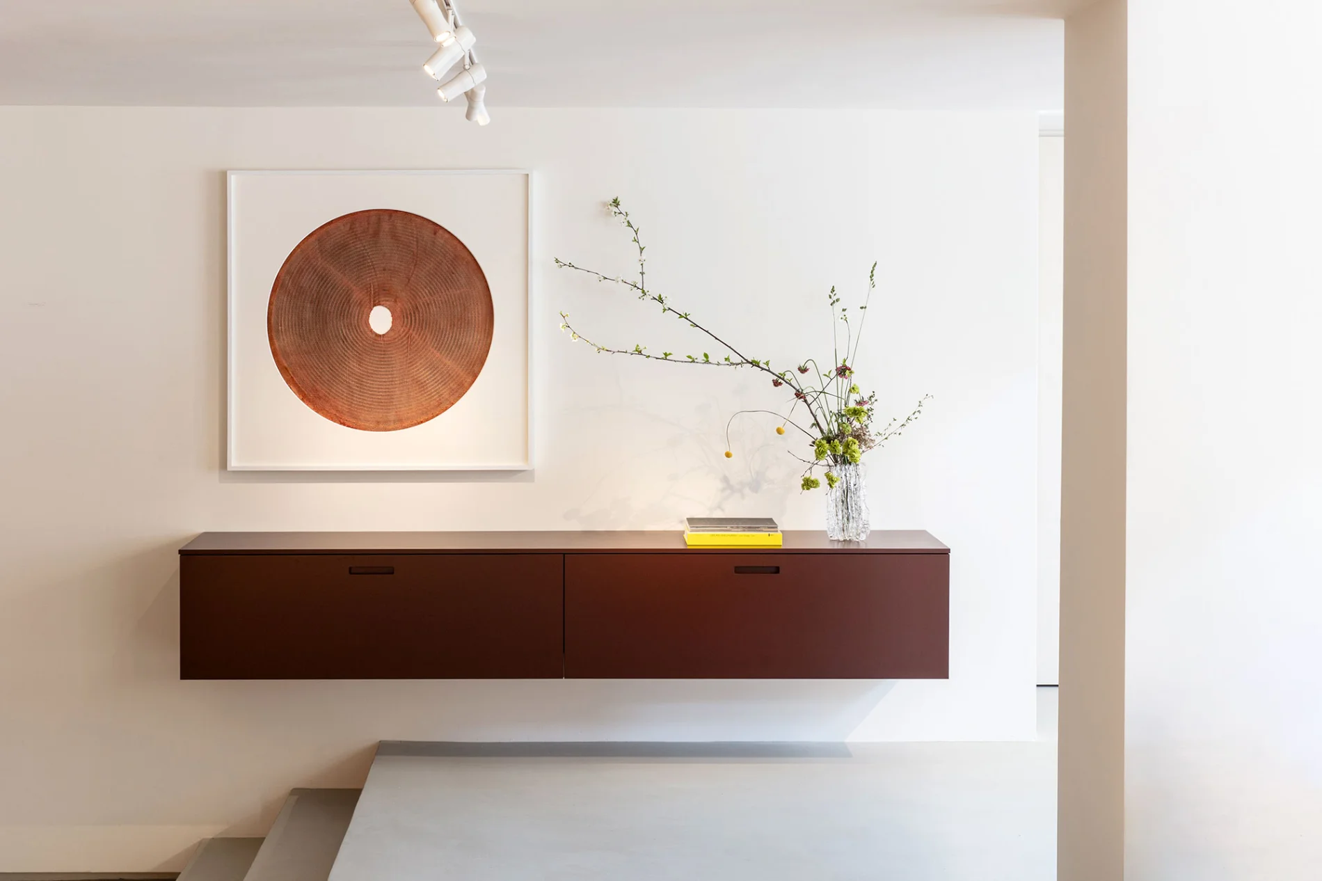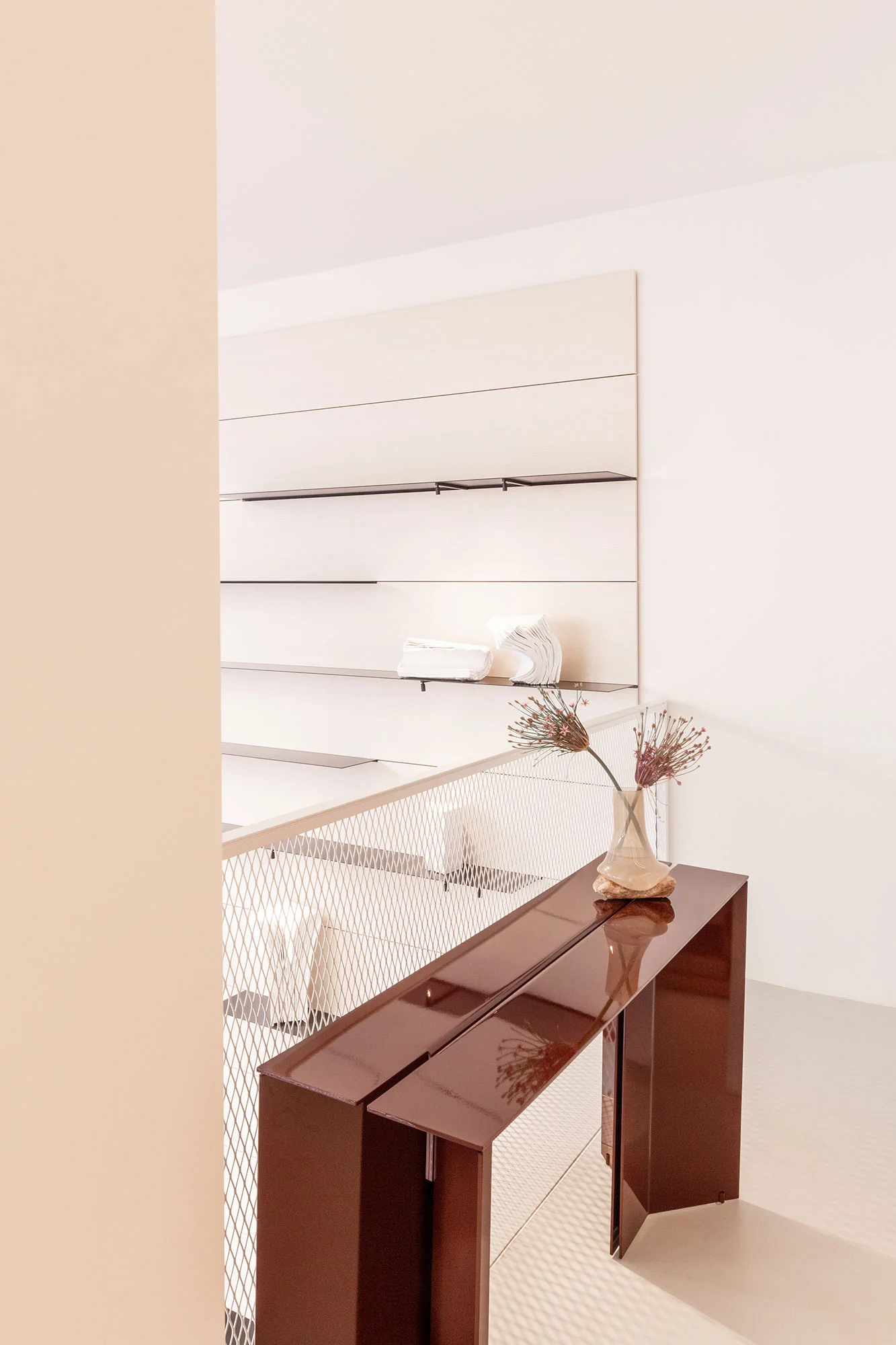 The suspended Modern composition in azuki lacquer, composed by two modules with flap door and Boite-Aux handle, recalls the system’s iconic rectangular arrangements from the 1990s. The result is a vibrant, contemporary atmosphere – where past and present engage in a continuous dialogue, shaping an ever-evolving design narrative.
