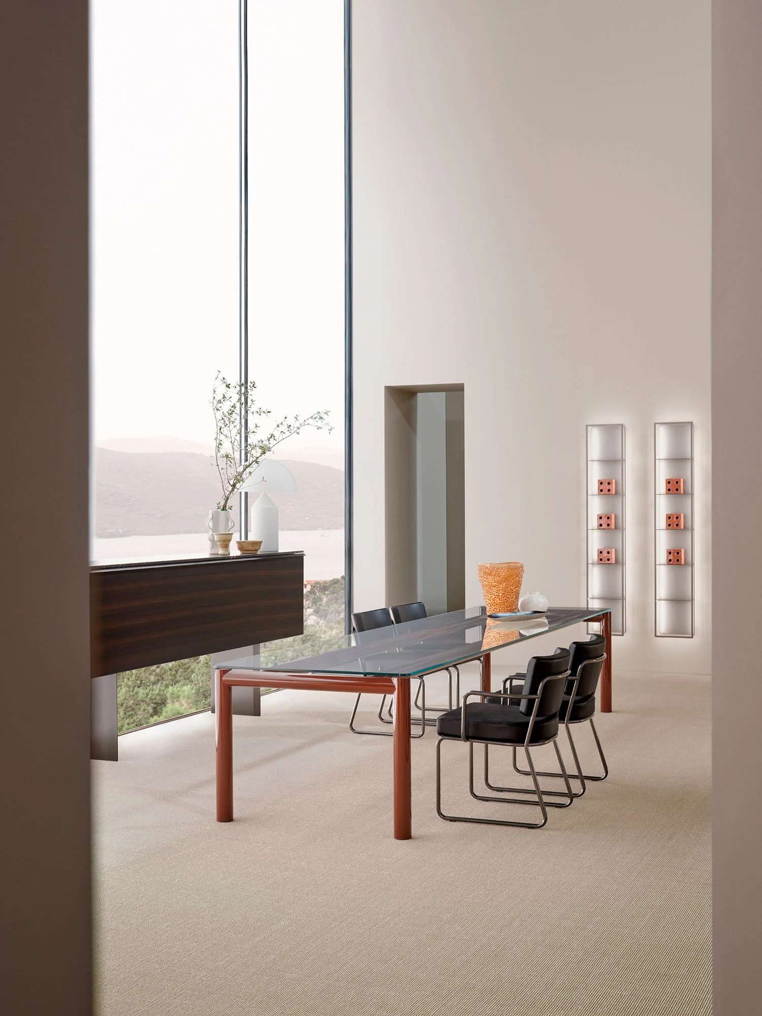 The poetics of essentiality: the Ventiquattro table captures attention for the boldness of its extreme reduction - the rectangular transparent glass top with bevelled edges, revealing the tubular stainless steel structure, varnished in azuki. Piero Lissoni focuses on pure lines and a rationalist approach, creating a piece of furniture with a technological and futuristic aesthetic.