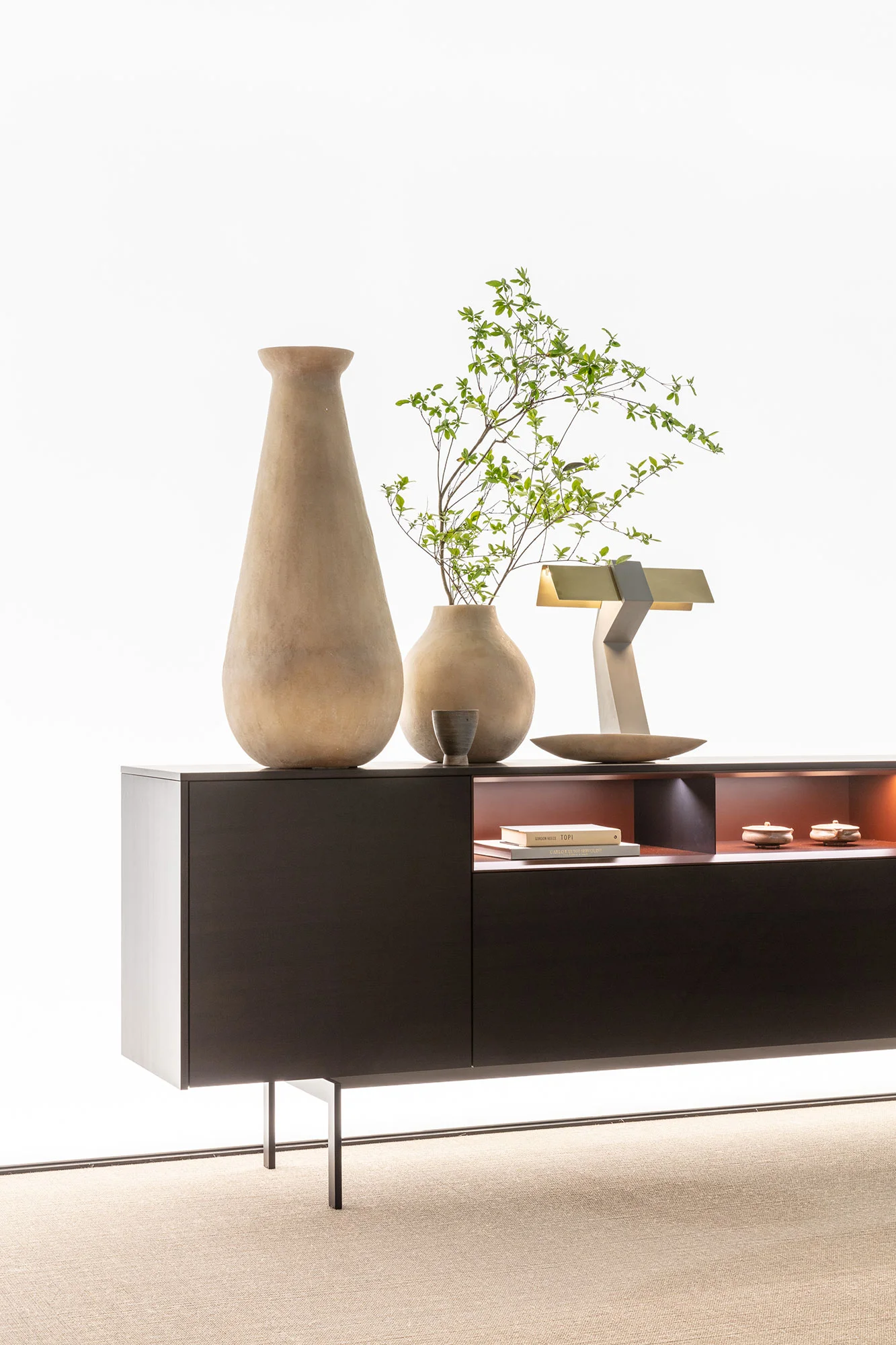 New interpretations for the self-standing sideboards by Modern, elegantly elevated on black-painted Bridge feet. The new tapered module by Modern opens the way to innovative solutions and material combinations. In this composition, for istance, the eucalipto covering top, side panels, and fronts make room are paired with an open module in the new matt azuki lacquer, equipped with lighting, to optimally illuminate the objects.