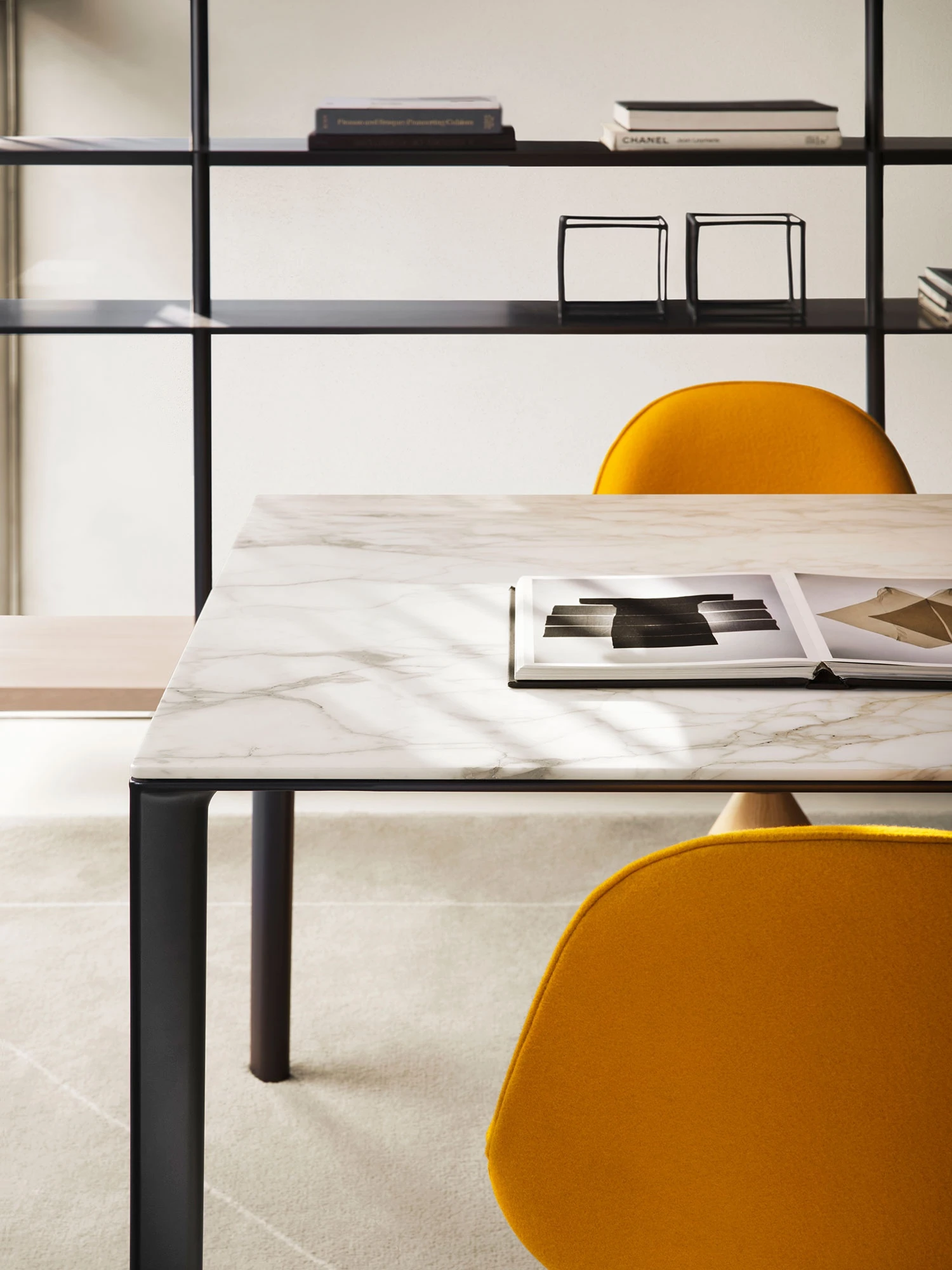 The industrial look is tempered by the low wooden shelf, in the name of naturalness.