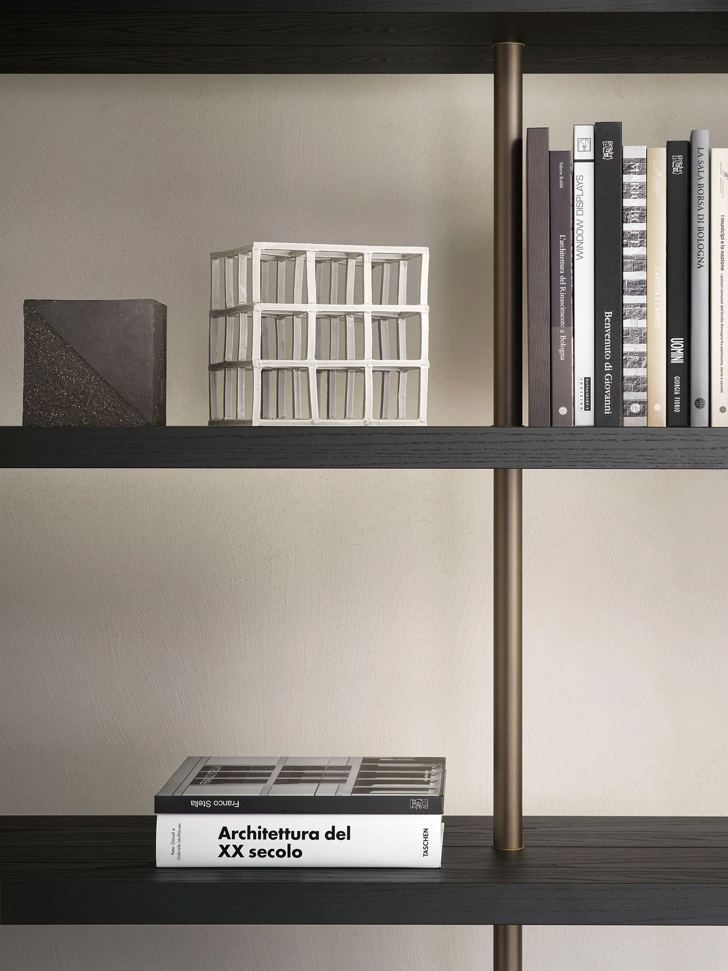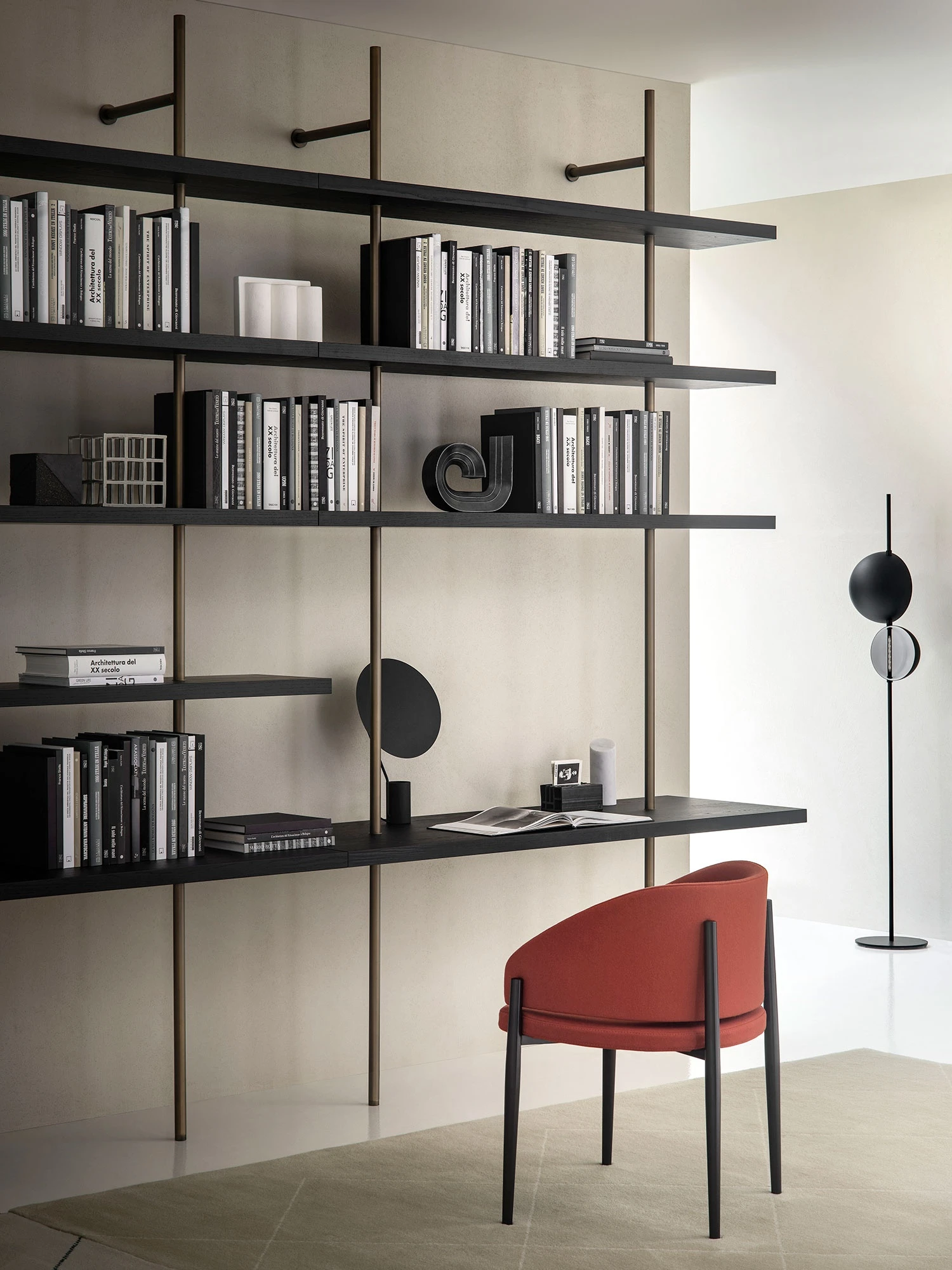 With its circular burnished brass upright and the black-stained hemlock shelves, the Boutique Mast wall-mounted bookcase creates a sequence of orthogonal lines, interrupted to make room for a homeworking station.