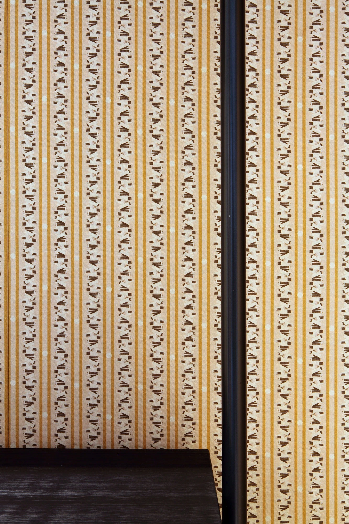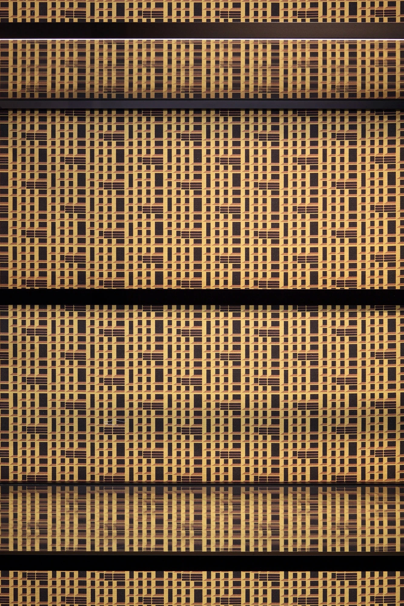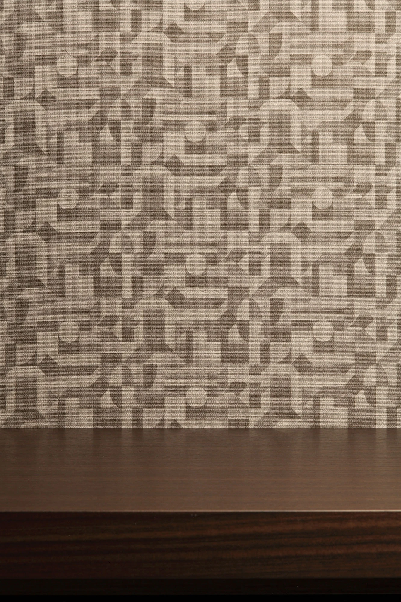 In the corridor, the niches in the wall host 3 Hinged Storage wardrobes closed by 32S doors with Clip burnished brass handles and by Riff doors: large surfaces that reveal a surprise while opening: interiors covered with a fabric characterized by a pattern of grey shades where the opposites of geometric and romantic mix themselves.