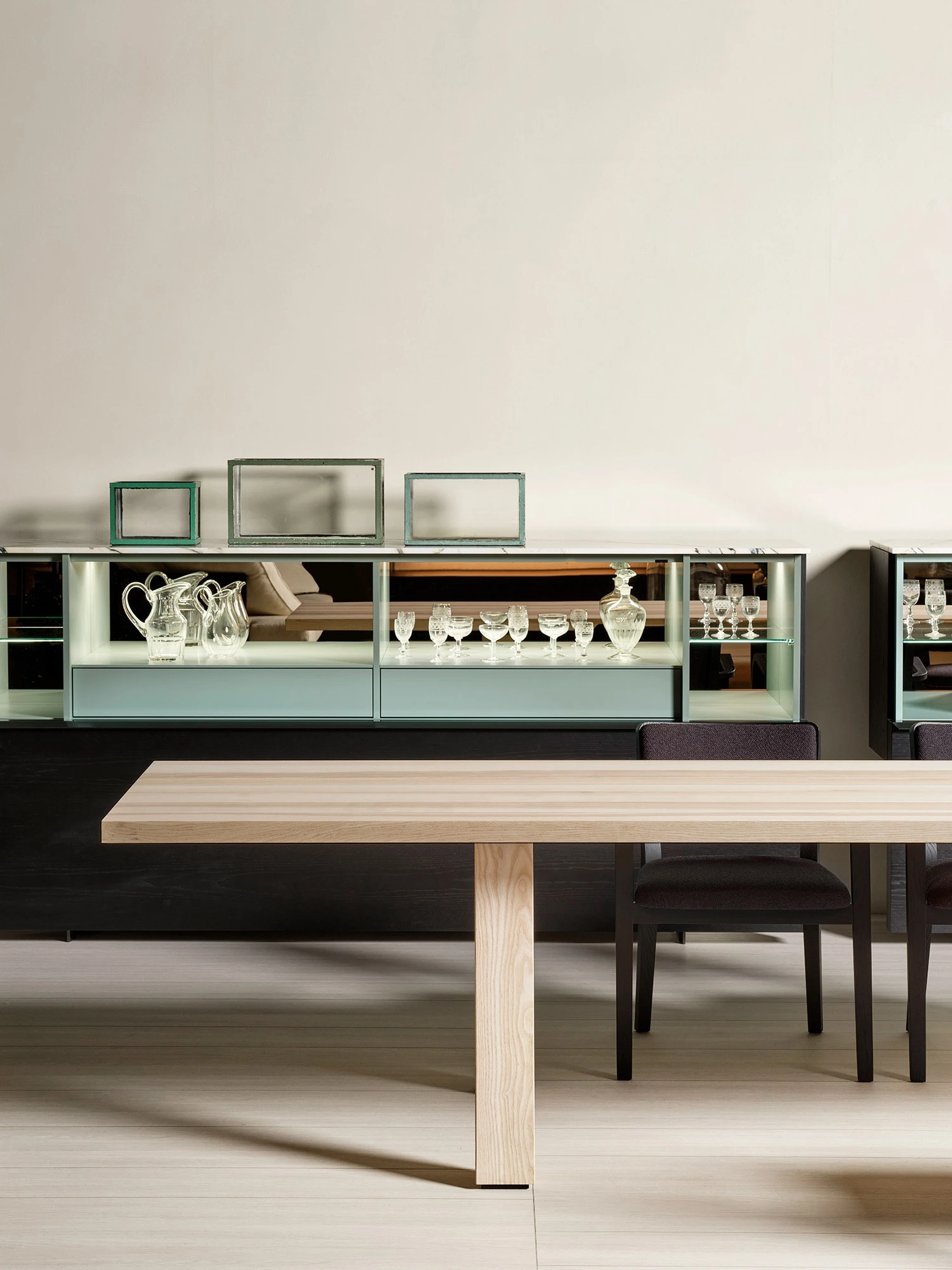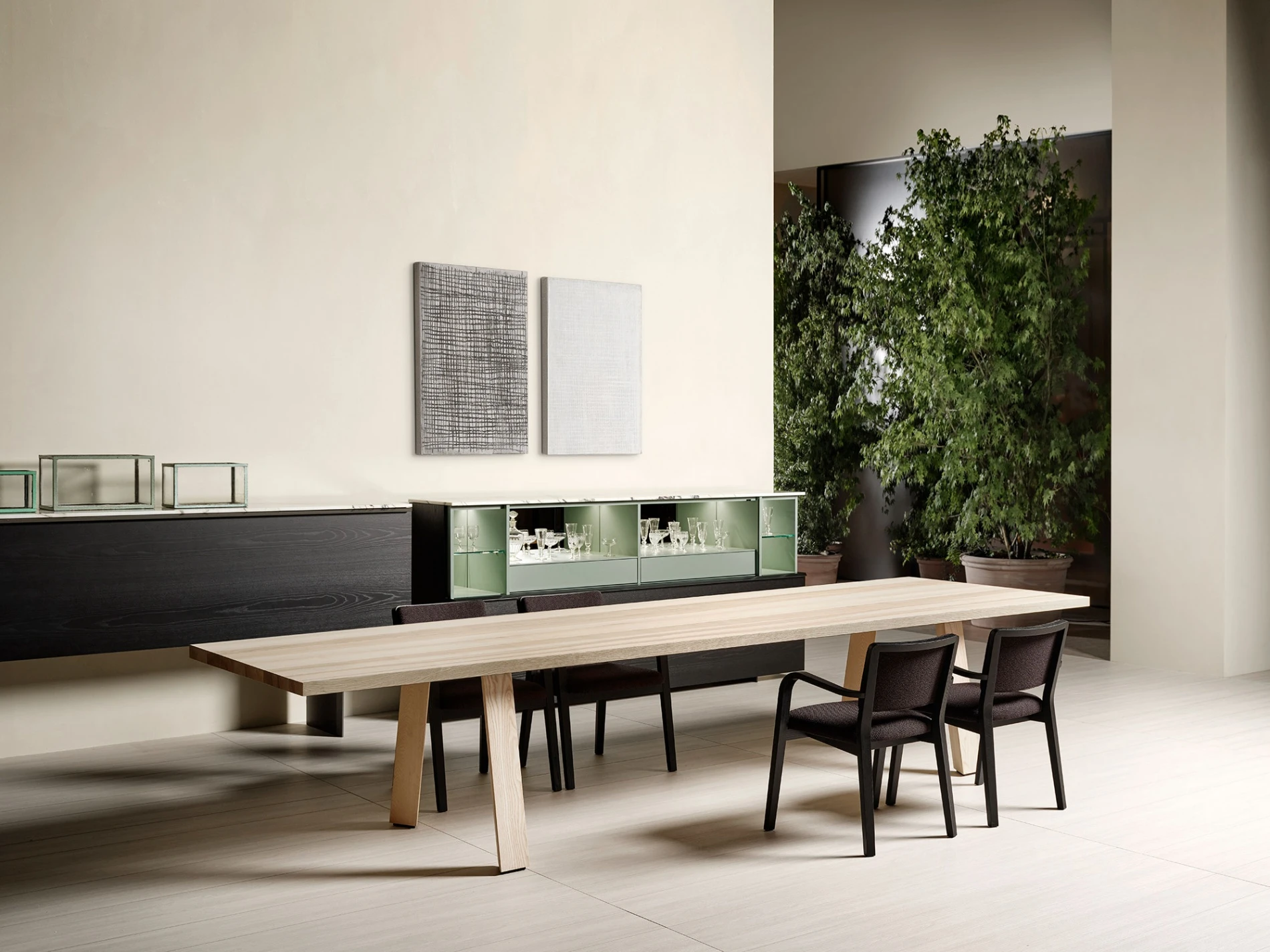 A tribute to natural materials and to the beauty of imperfection, the Ryoba table features legs and a very thick solid olive ash wood top. The legs with a triangular section create an easel supporting the textured table top, that is made up of solid boards – each one different from the other - carefully selected by the master cabinetmaker. The proportions of the table, which is narrow and long to match the natural size of the trunks, invite to a new intimate conviviality, while the exposed cracks and tiled knots underscore the poetry of this beautiful wood type.