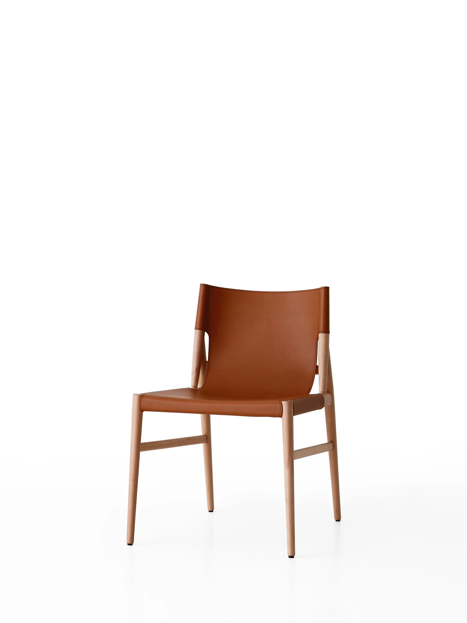 Voyage is a chair with precise contours that draws inspiration from typical 1950’s furniture, making it up-to-date. Voyage is made up of an exposed framework in tapered solid maple; across it, a leather covering is stretched and gives shape to a very comfortable and ergonomic seat and backrest.