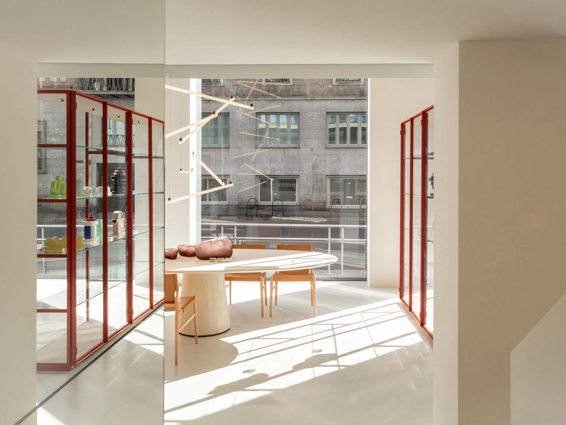 A new exceptional variant of a classic. Glass cabinet with a precious look and feel, Ex-Libris stands out in the space thanks to its metal frame painted in rosso antico: an eye-striking choice in contrast with the dark base and top in black sugi melamine or lighter in white cherry, that highlights the items displayed inside this evocative box enclosed by Iron doors in transparent glass.